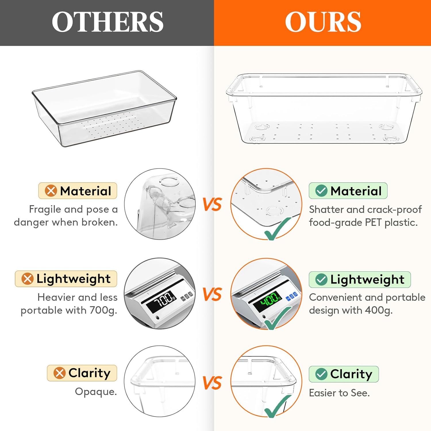 - Crystal Clear: Made of high-quality PET plastic with a crystal-clear appearance that enhances both aesthetics and functionality. Their transparent design allows for easy organization and quick retrieval of items
