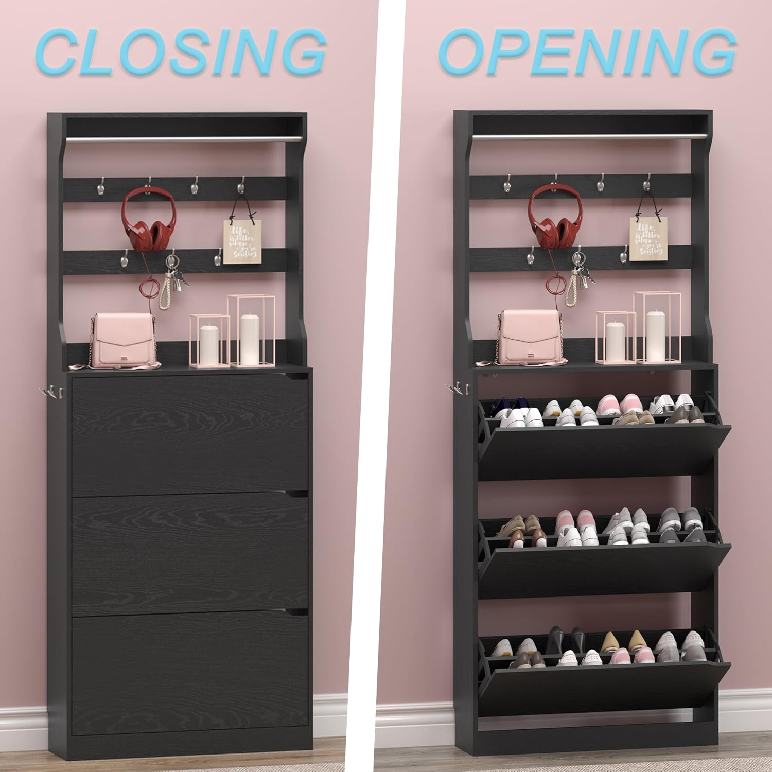 Shoe Cabinet with 3 Flip Drawers & Coat Rack, Narrow Hidden Shoe Storage Cabinet, 2-in-1 Hall Tree Slim Freestanding Shoe Rack Organizer for Entryway, Hallway, and Living Room