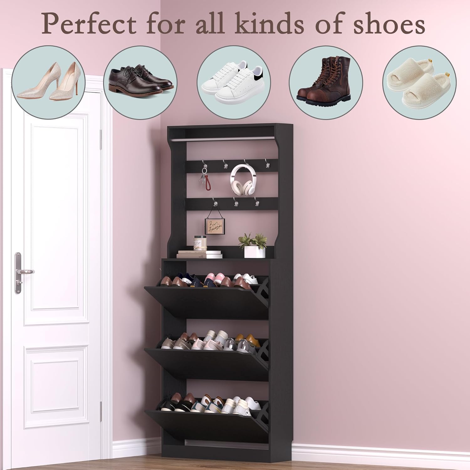 - 【Adjustable & Large Capacity Storage】: BORNOON shoe cabinet measures 9.45"D x 31.5"W x 78.74"H. Each of the 3 flip-out drawers contains an adjustable or removable middle panel, allowing you to customize the space to fit boots, sneakers, heels, and flats. The added coat rack provides hooks and a hanging bar for coats, scarves, and bags.