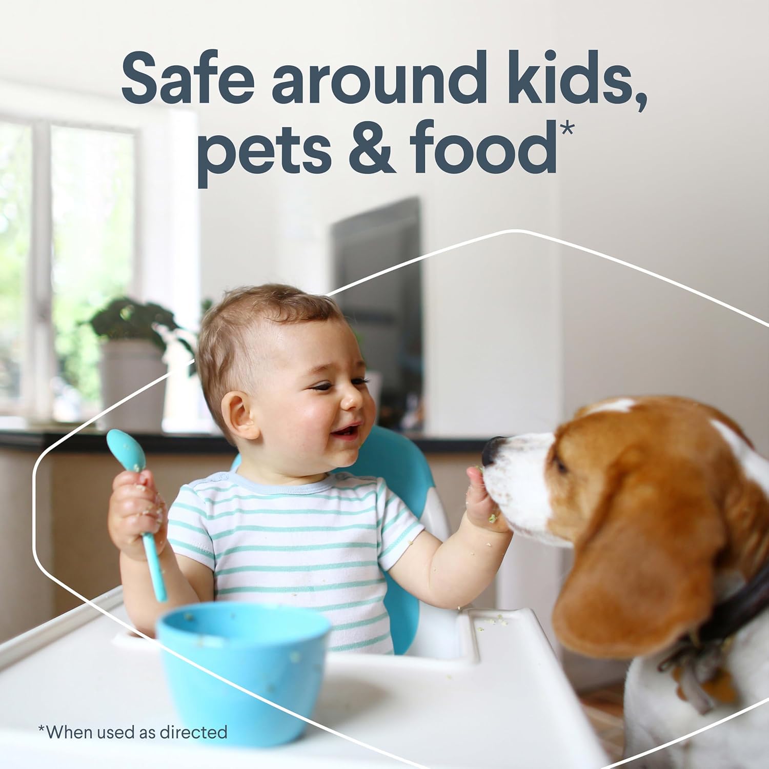 - SAFE AROUND KIDS, PETS AND FOOD*: This all purpose cleaner is great on kitchen surfaces, changing tables, high chairs, pet bowls and pet crates, and bathroom surfaces, all with no rinse required