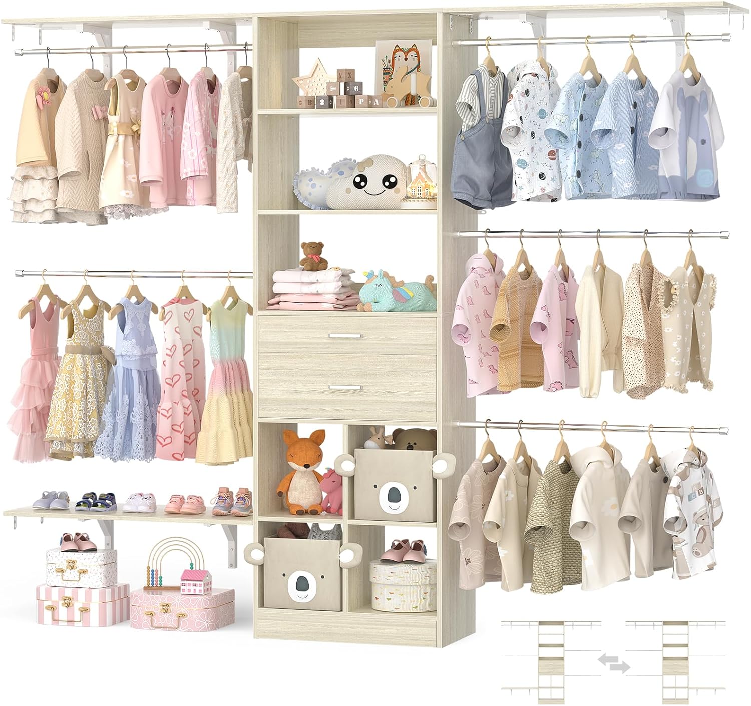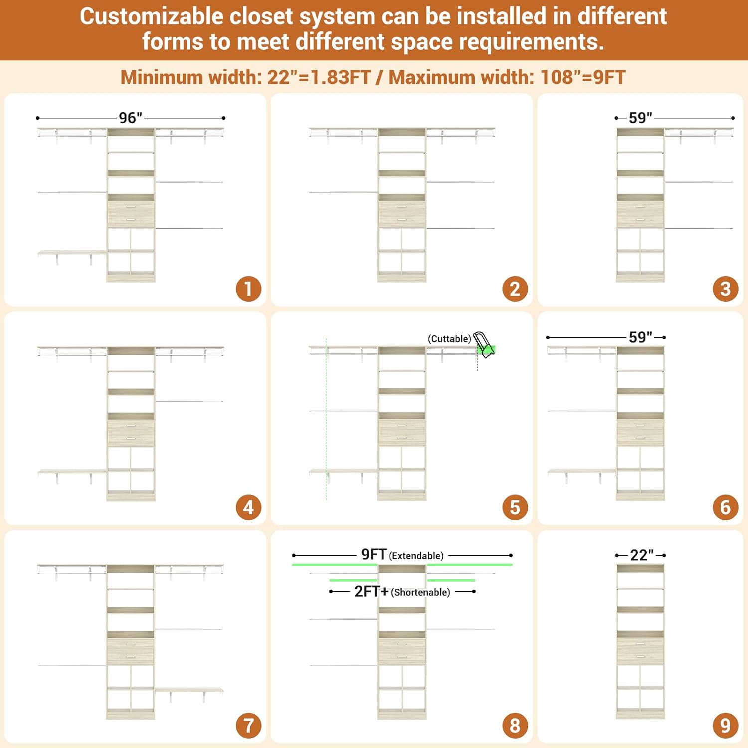 - Customizable Closet System - Besiost closet system with drawers is a valuable addition to your nursery organization and walk-in closets. The small modern closet comes with additional cuttable shelves and adjustable hanging rods, designed to fit well in nurseries of varying sizes. Width: 59"–96", Height: 80"