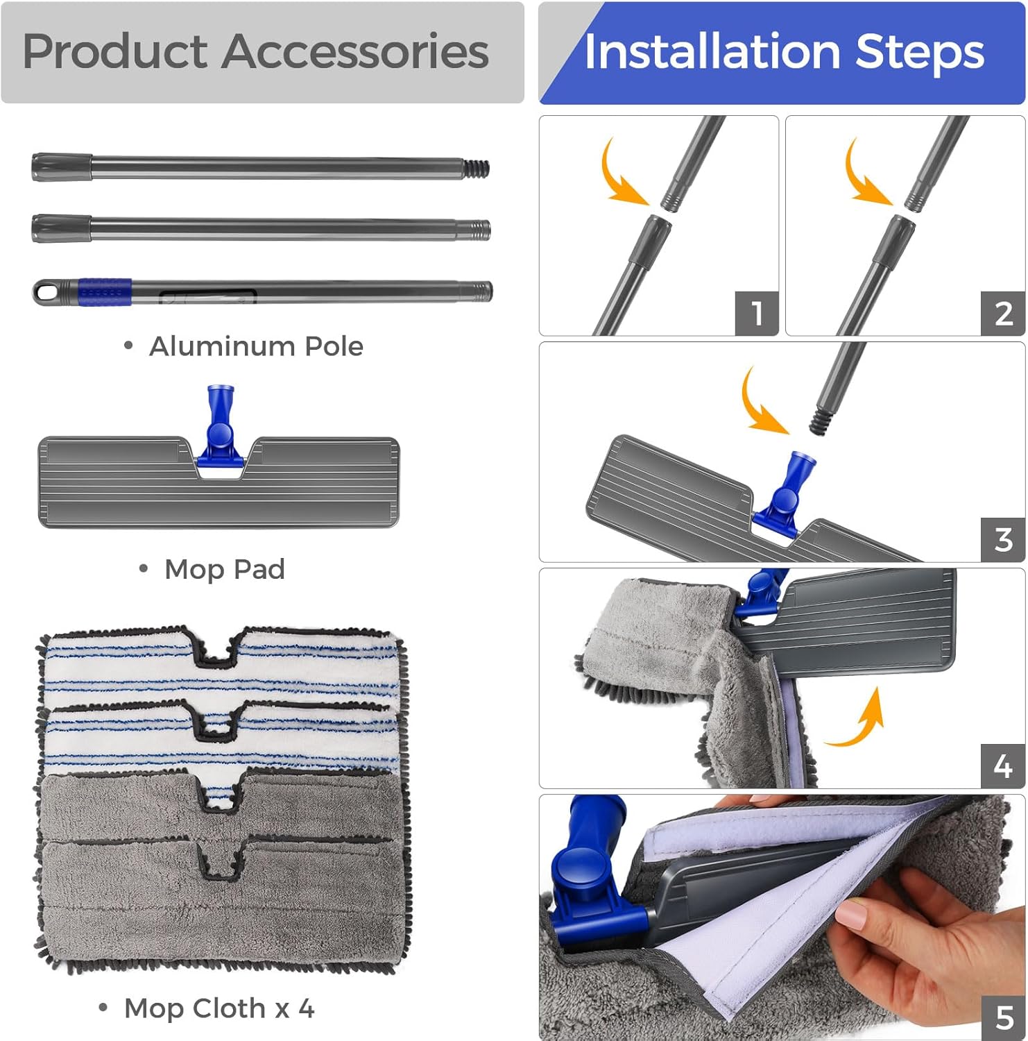 - [Extendable Durable Design] The microfiber mop is equipped with 45-inch durable and lightweight stainless steel metal poles. And the dust mop can adjust the handle length according to actual needs, making the floor mop easy for different people to use without bending over for cleaning.