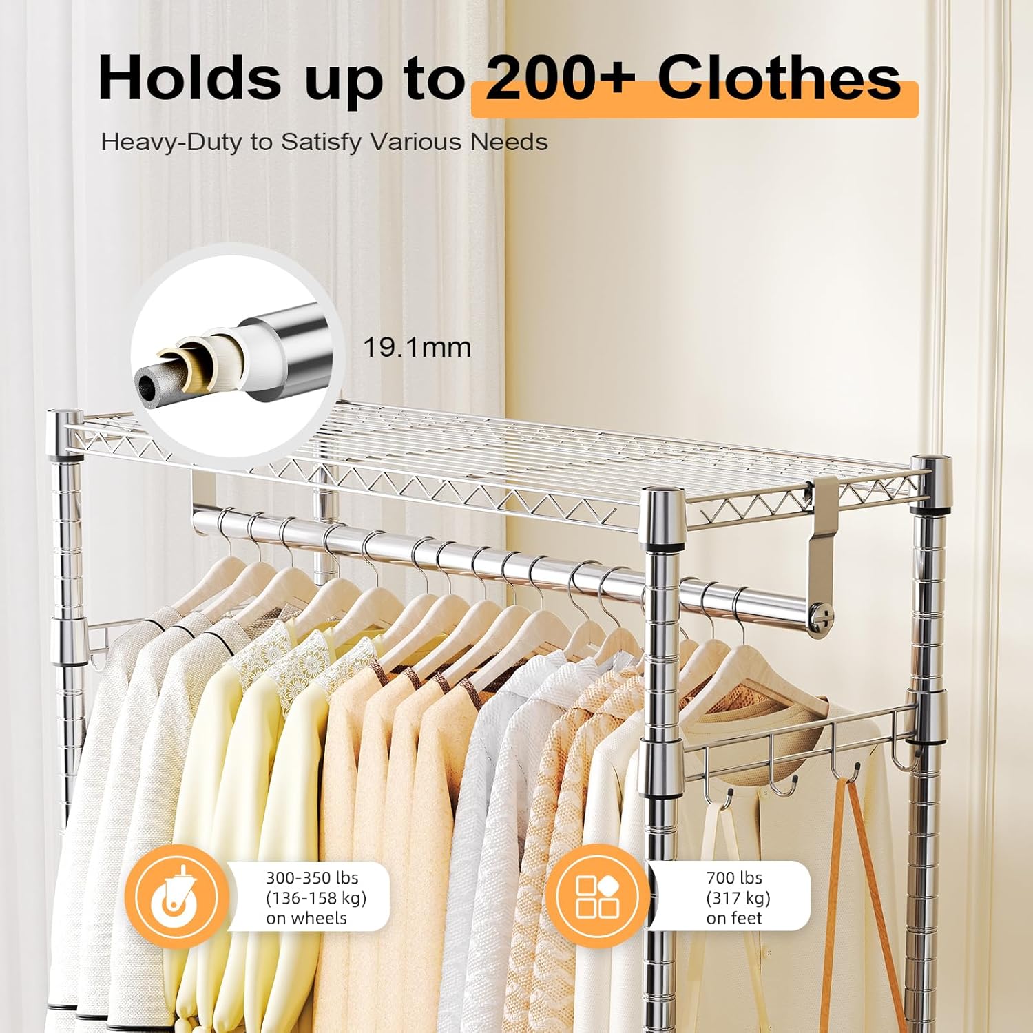 - Lockable 360° Wheels And Multifunctional: This rolling clothes rack has 4 heavy-duty rolling wheels, and thus you can easily move anywhere you need, such as the entry closet, laundry room, hallway, balcony, bedroom, cloakroom, bathroom, garage, and more. And 2 of them are lockable, which ensures more safety.