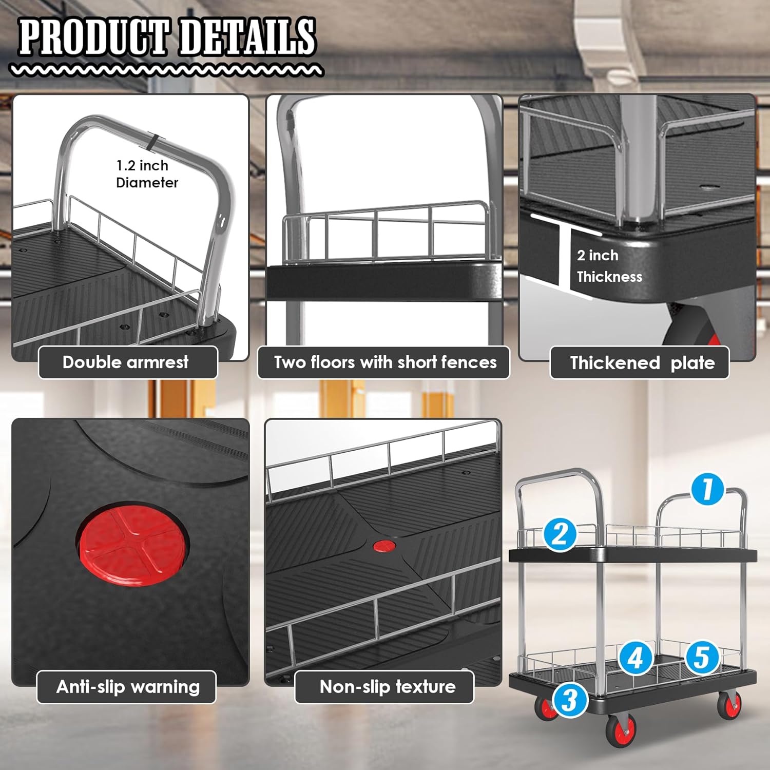 - 【Double layer design】 The platform of the utility cars is made of 2 pieces of new plastic materials. The 2-shelf utility service cart consists of connected support rods. The design of double handrails and 4 swivel wheels improves comfort in the usage workflow. The removable fence on the side can carry items of different sizes. The textured platform surface helps prevent cargo from slipping off the cart. It's a practical tool cart in life