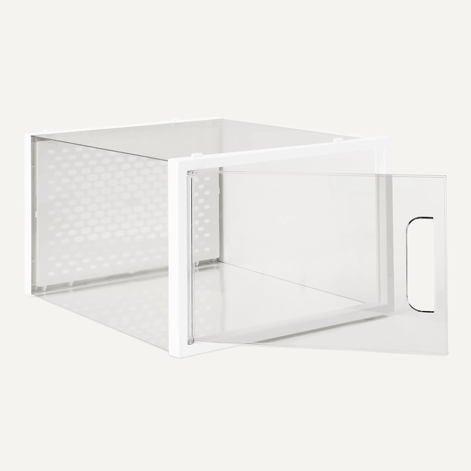 - Clear shoe storage boxes made with durable, transparent PET plastic for easy visibility of contents
