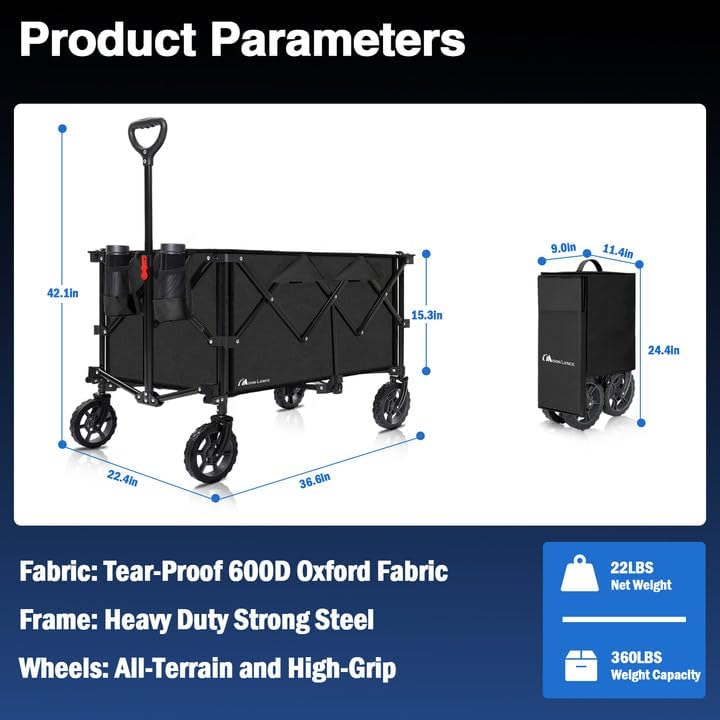 - Compact Storage: Fully open, the foldable wagon measures 42.1" x 36.6" x 22.4"; when folded, it’s just 24.4" x 14.4" x 9", saving over 80% of space. Lightweight at 22 lbs with two convenient cup holders, this wagon cart fits easily in the trunk or at home