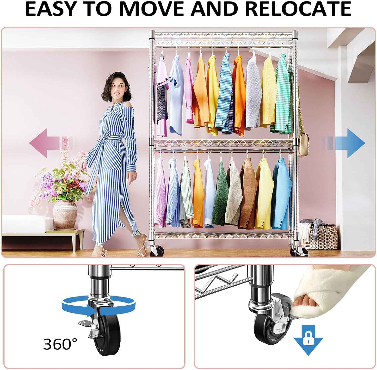 - Rotatable 360° Wheels And Versatile: This rolling clothes rack has 4 heavy-duty rolling wheels, and thus you can easily move anywhere you need, such as the showroom entry closet, bathroom, garage, laundry room, hallway, balcony, bedroom, cloakroom, and more. And 2 of them are lockable, which ensures more security