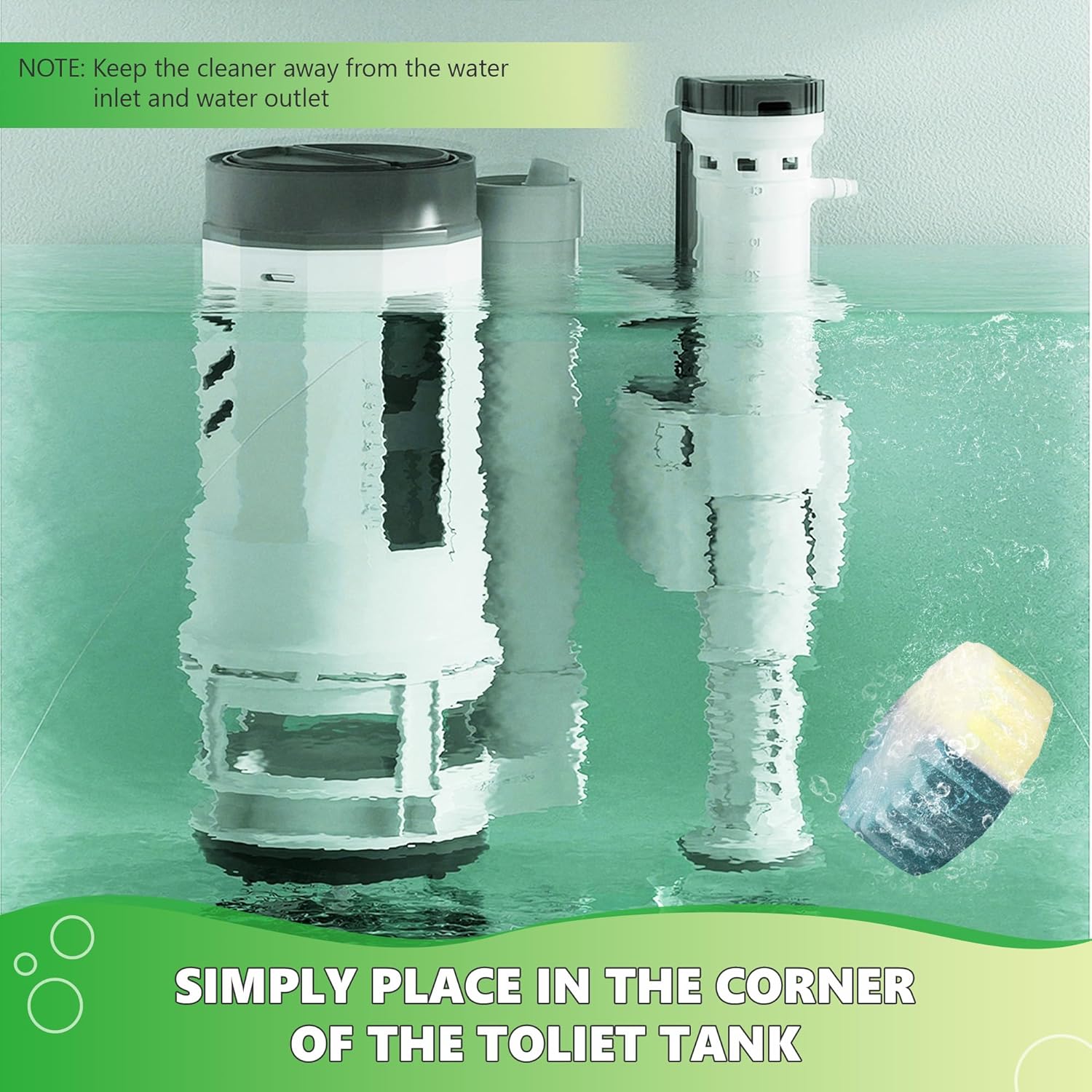 - Easy to Use: Simply place a piece of toilet tank cleaner tablet into the tank (away from the spout and inlet) and let it fully dissolve for at least 30 minutes;(Please note, do not remove the water-soluble transparent protective film)