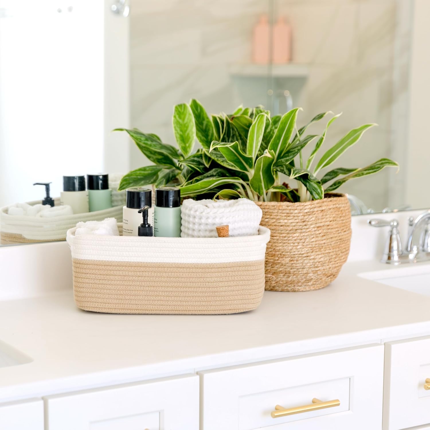 - Safe, Natural Cotton Organizer Bins: Crafted from the highest quality material in the market, our storage bins are oh-so-sturdy (and cute) and ready to take on little humans. They’re 100% safe, so you can rest easy if teething toddlers take a nibble. Reinforced Hidden Handles: Now you see ‘em, now you don’t! With completely hidden handles that blend seamlessly into the rope basket, you’ll be the Houdini of home organizing. They’re even double-stitched and reinforced for extra heavy loads!