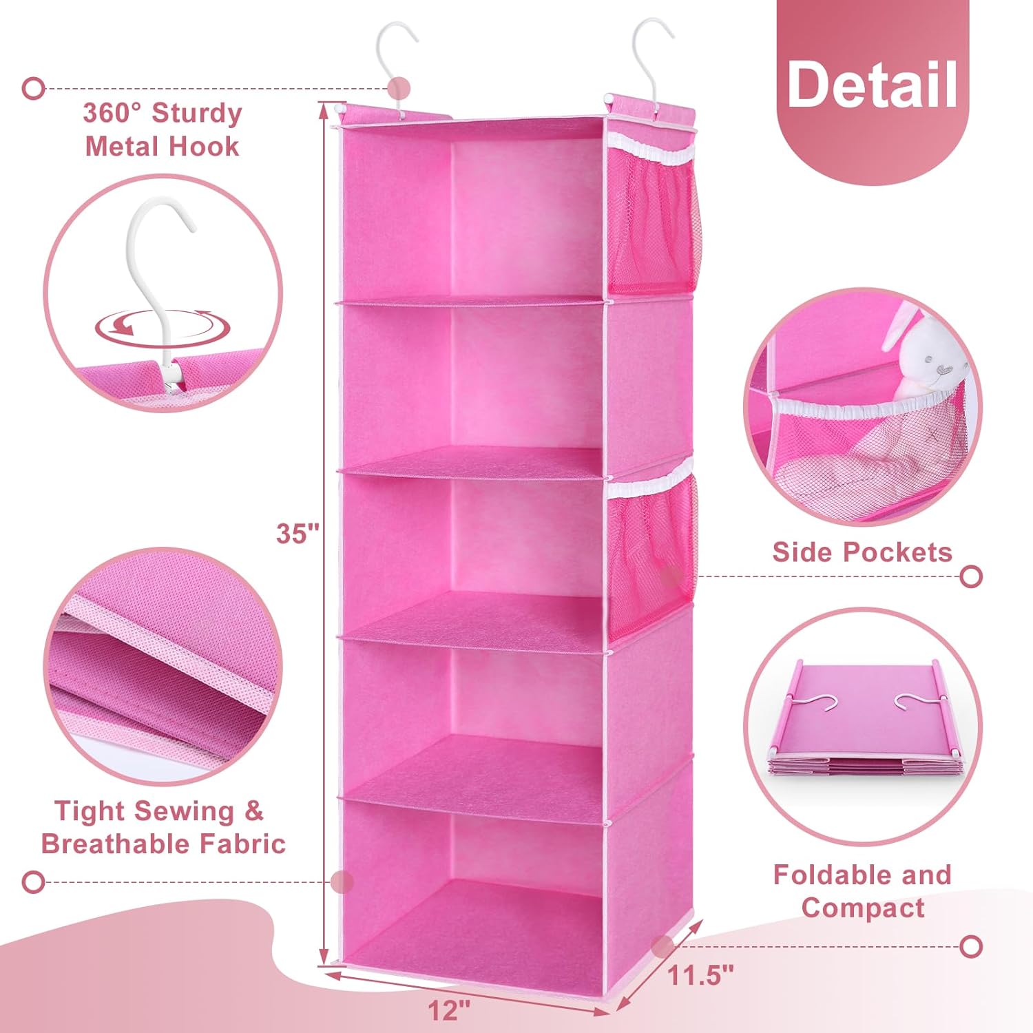 MAX Houser 5-Shelf Hanging Closet Organizer, Hanging Storage Shelves with 4 Side Pockets Space-Saving for Bedroom, Foldable (Pink)