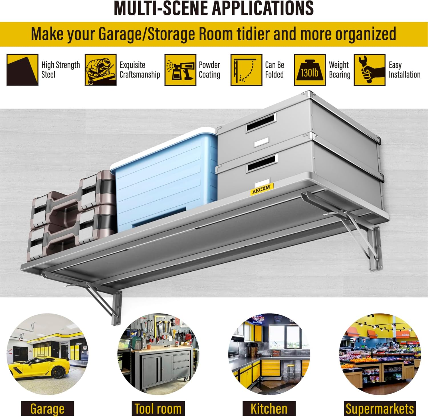 - SUPERIOR DESIGN: The foldable garage storage shelf panel is made of whole steel plate, The surface of matte high temperature powder baking paint, Flat and smooth, Panel with sliding rail design, The bracket can be installed freely in the range of 12"-45" spacing of wood wall keel, And at the same time it adopts folding bracket, Which can be freely stowed away or unfolded