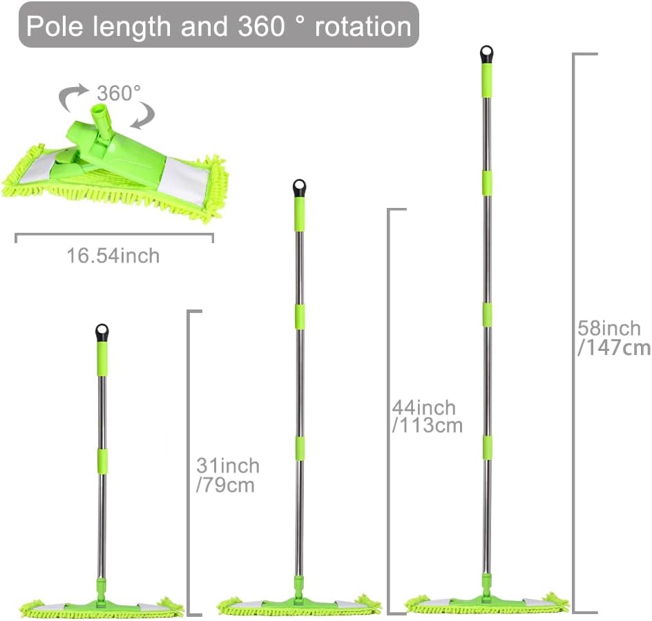 Dust Mop for Floor Cleaning with 2 Washable Chenille Pads and Extendable 58” Long Handle, Dry Wet Flat Mop with Scouring Pad for Hardwood, Laminate, Tile, Marble ,Green