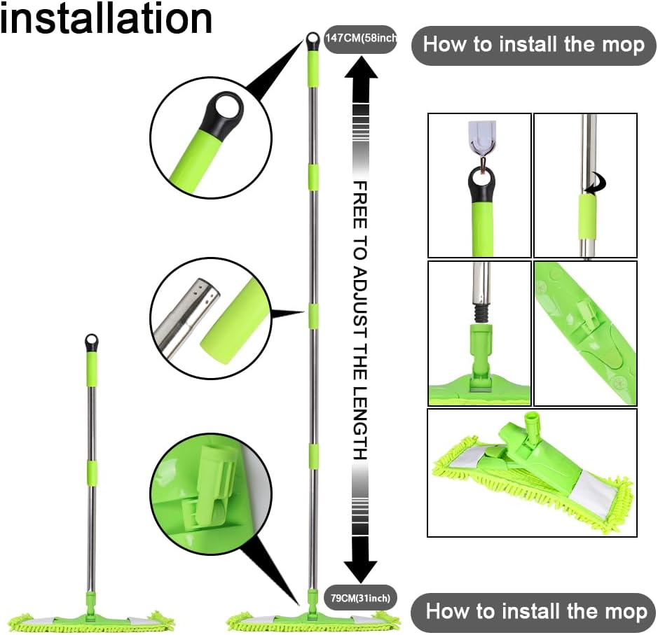 - Lightweight &. Adjustable Long Handle: The flat mop is designed with 4 sectional handles, which can be adiustedfrom 31 inches to 58 inches. You can adiust length of handle according to your needs.And this light weight mop isvery suitable for ladies and the elderly.