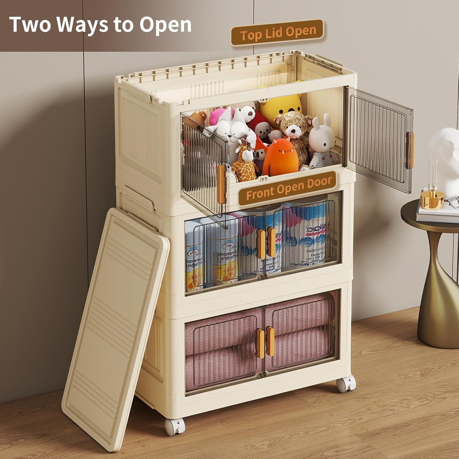 - Stackable & Removable Design: Foldable storage bins and a stackable storage box. Each level has matching grooves and clasps on the top sides to lock the storage bins securely, and the foldable design maximizes space in your home when not in use. There are 4 rotating wheels on the bottom for easy movement