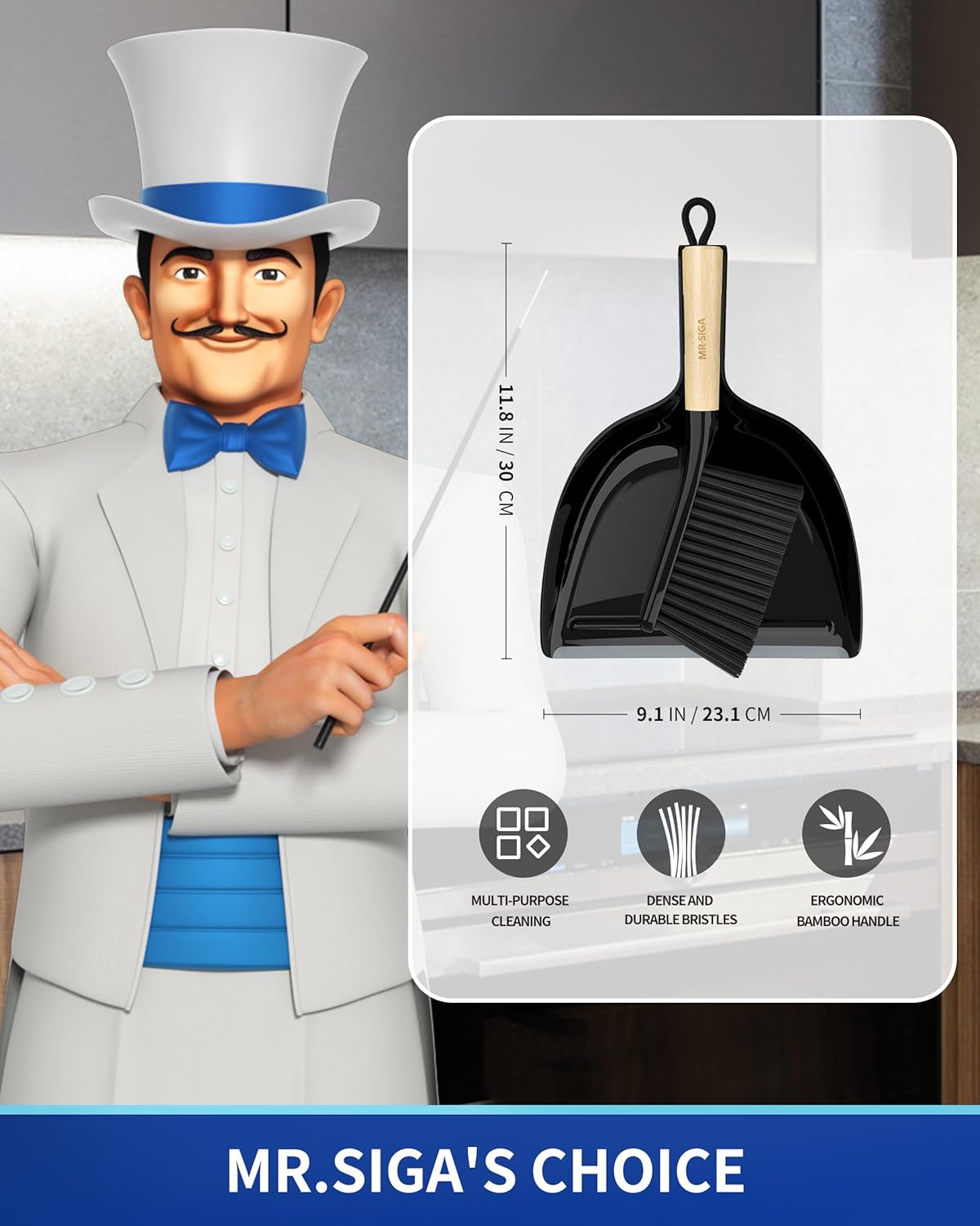 - Elegant and compact design. MR.SIGA handheld dustpan and brush set has a natural bamboo handle, its portable design makes it easy to carry and store, ideal for quick clean-ups anywhere in the home or office. Measures 13 " x 9.2 "