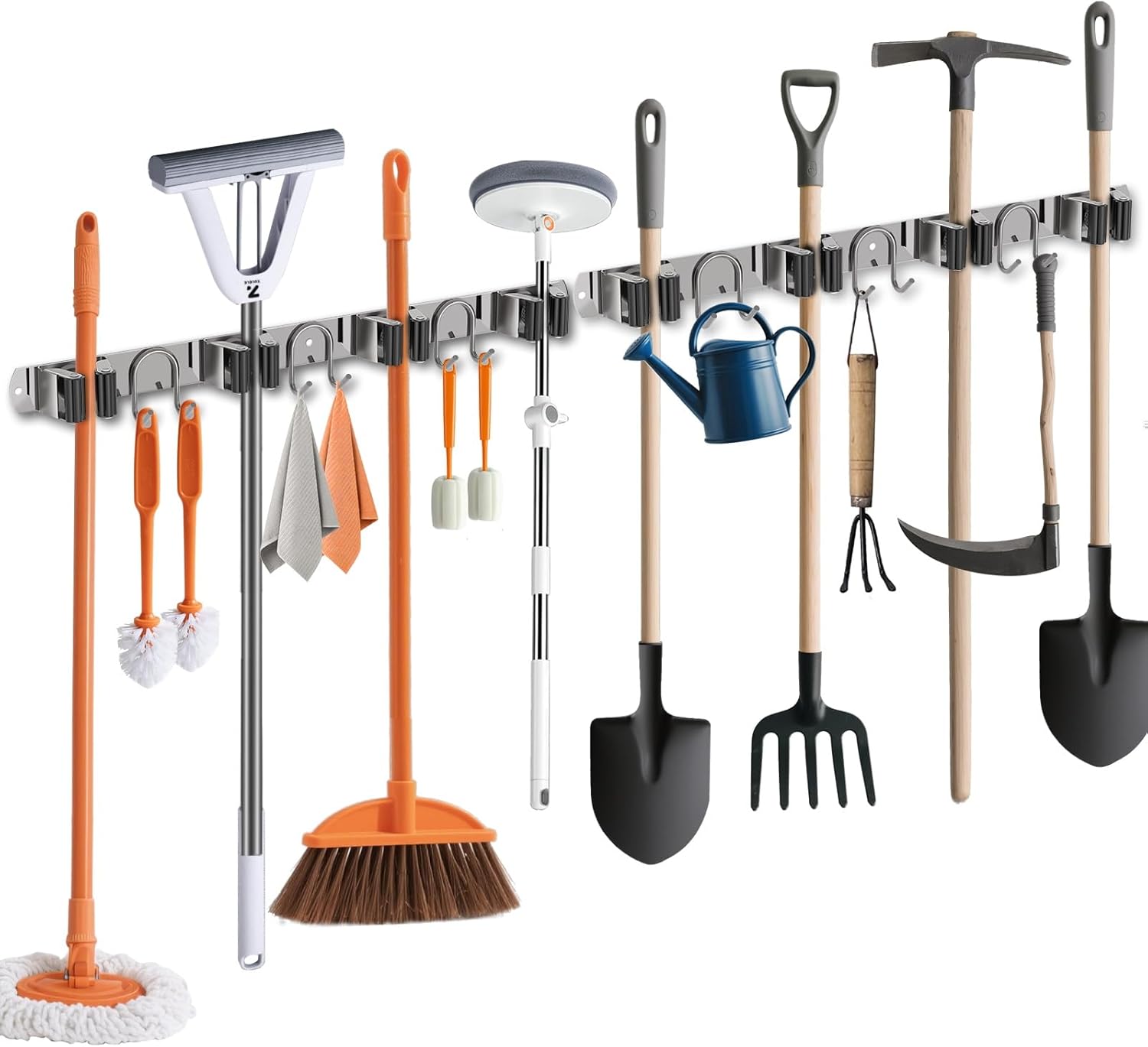 - Spacious 6-Hook Mop Holder: Features 4 slots and 6 hooks with smart spacing (5.12" slots, 4.72" hooks) for maximum storage. Saves space while holding multiple brooms, mops and tools effortlessly
