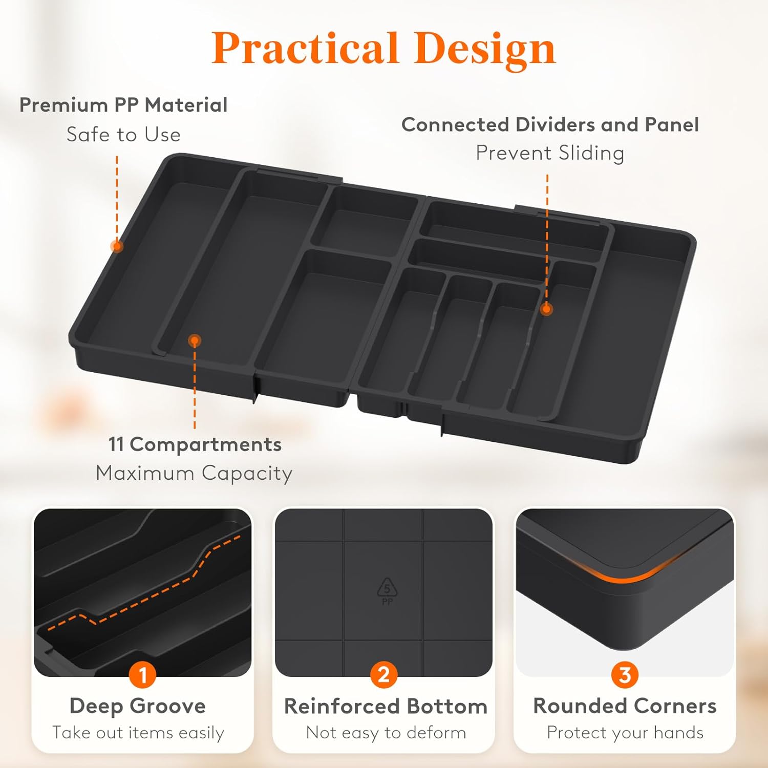 - Robust and Safe: This kitchen drawer organizer is crafted from premium PP material, BPA-free and built to last. It ensures your silverware is stored in a healthy, safe environment for worry-free use