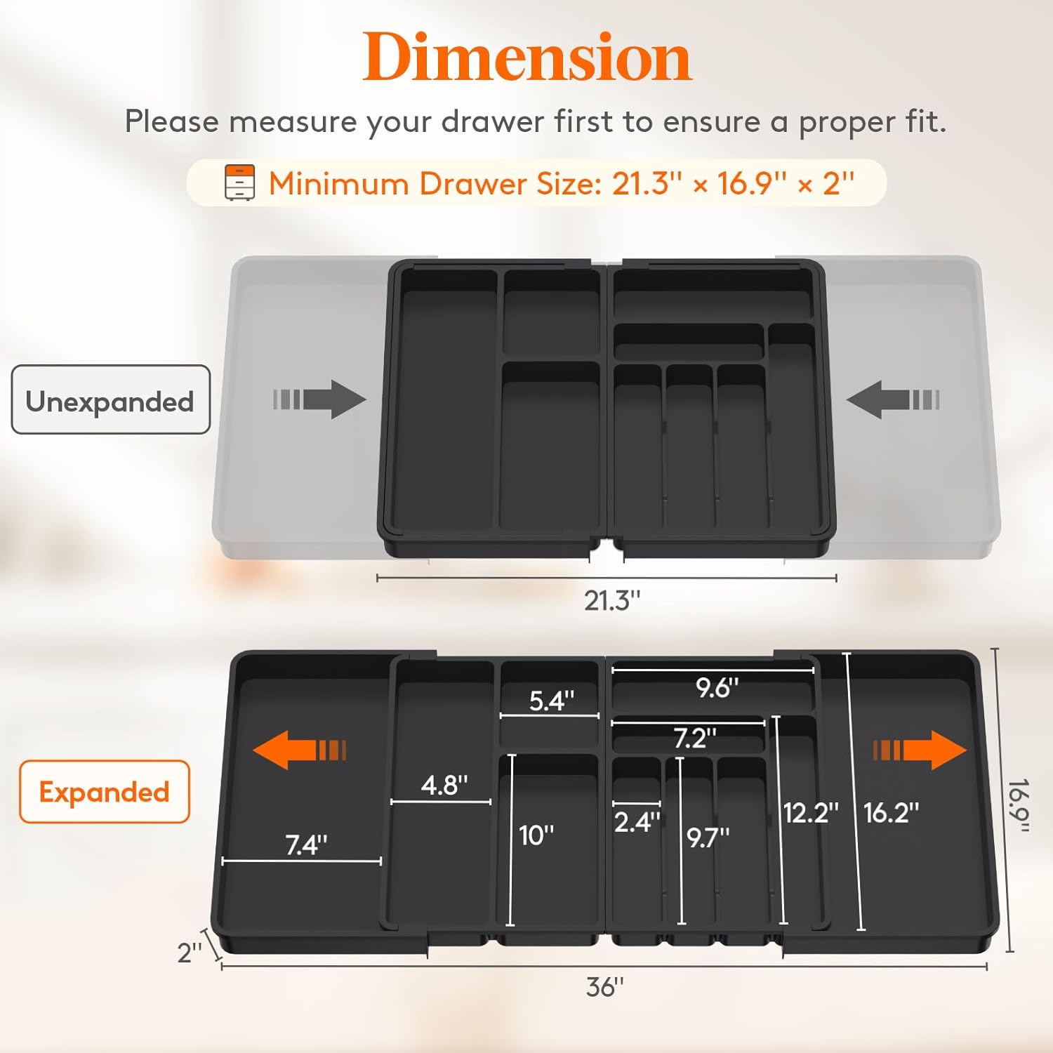 - Adjustable Design: With its retractable design, The Lifewit silverware organizer fits drawers of various sizes and shapes. It measures 21.3' wide when folded while reaching 36'' when fully expanded. This universal utensil drawer organizer helps you maximize storage space efficiently while keeping your utensils neatly organized and easily accessible