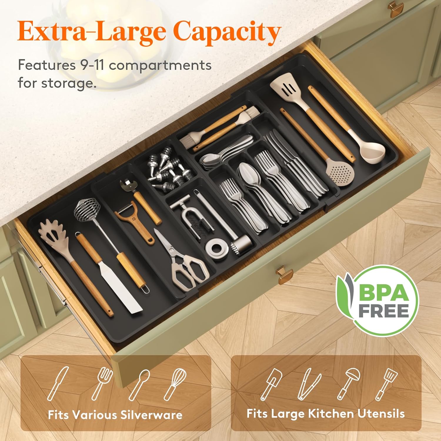 - Sort Your Silverware: The silverware tray comes with 9-11 compartments, creating more space in drawers for spatulas, ladles, tongs, utensil sets, and whisks. Streamline your cooking with a no-install organizer that keeps cutlery at your fingertips