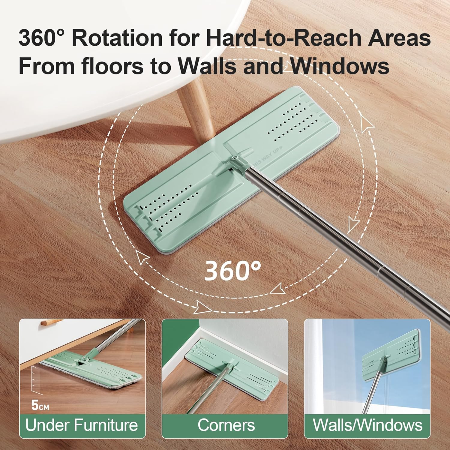 - [Extended Microfiber Mop] With 360°rotation and bigger mop head, the flat mop can reach to any corners, those "under-the-whatever" and more wider places for much faster cleaning job! The adjustable Stainless Steel Handles can be extended from 26.5 to 60.0 inches, great for wet dry mops or dust mops for wall cleaning