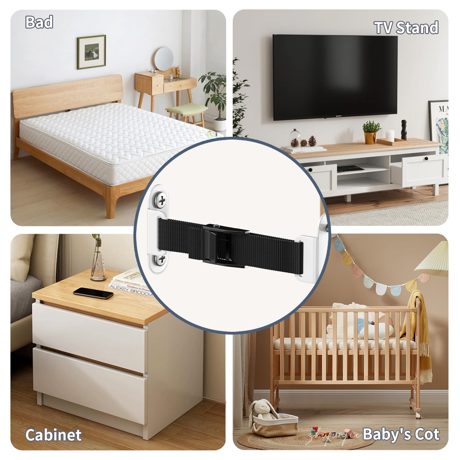 - 2. Easy to Install: This baby-proof furniture anchor is easy to install: fasten one end to the back of the furniture and the other to the wall, with the whole process taking just a few minutes. It is equipped with an adjustable hardware buckle; when you need to move the furniture or clean the back of it, simply press the buckle’s switch to easily release the anchor.