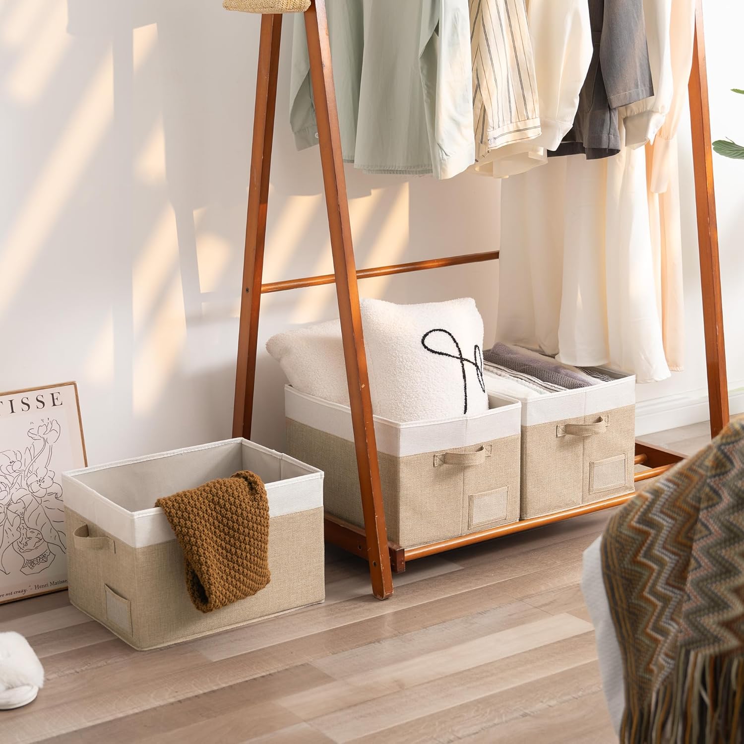 - Eco-Friendly Material - Made of textured linen-like fabric, breathable and wear-resistant, without irritating odor. Fabric boxes come in sets of 3, each measuring 15½"L x 11¾"W x 10¼"H.