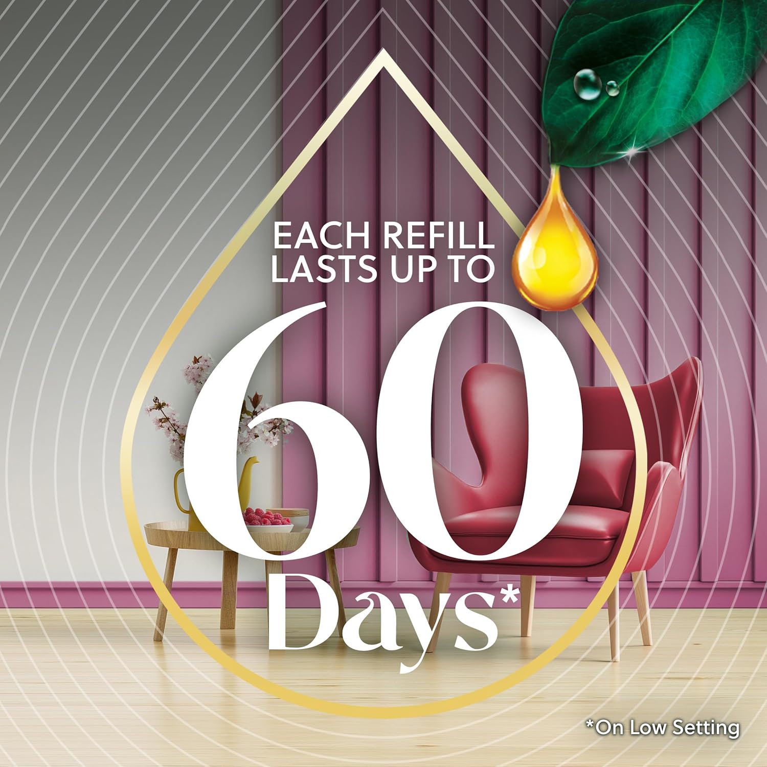 - Enhance your home’s scent with Air Wick Scented Oil Refills with continuous fragrance for up to 60 days (based on low setting). Our air freshener plug in refills are infused with 100% natural essential oils. Our latest Air Wick scented oil warmer optimizes airflow for 360-degree fragrance diffusion, reaching every corner of the room for a consistent fragrance experience. The Air Wick Scented Oil warmer allows you to choose between 5 fragrance settings for just the right amount of fragrance. It continuously diffuses and carefully blends fragrance throughout your home, office, or any space.