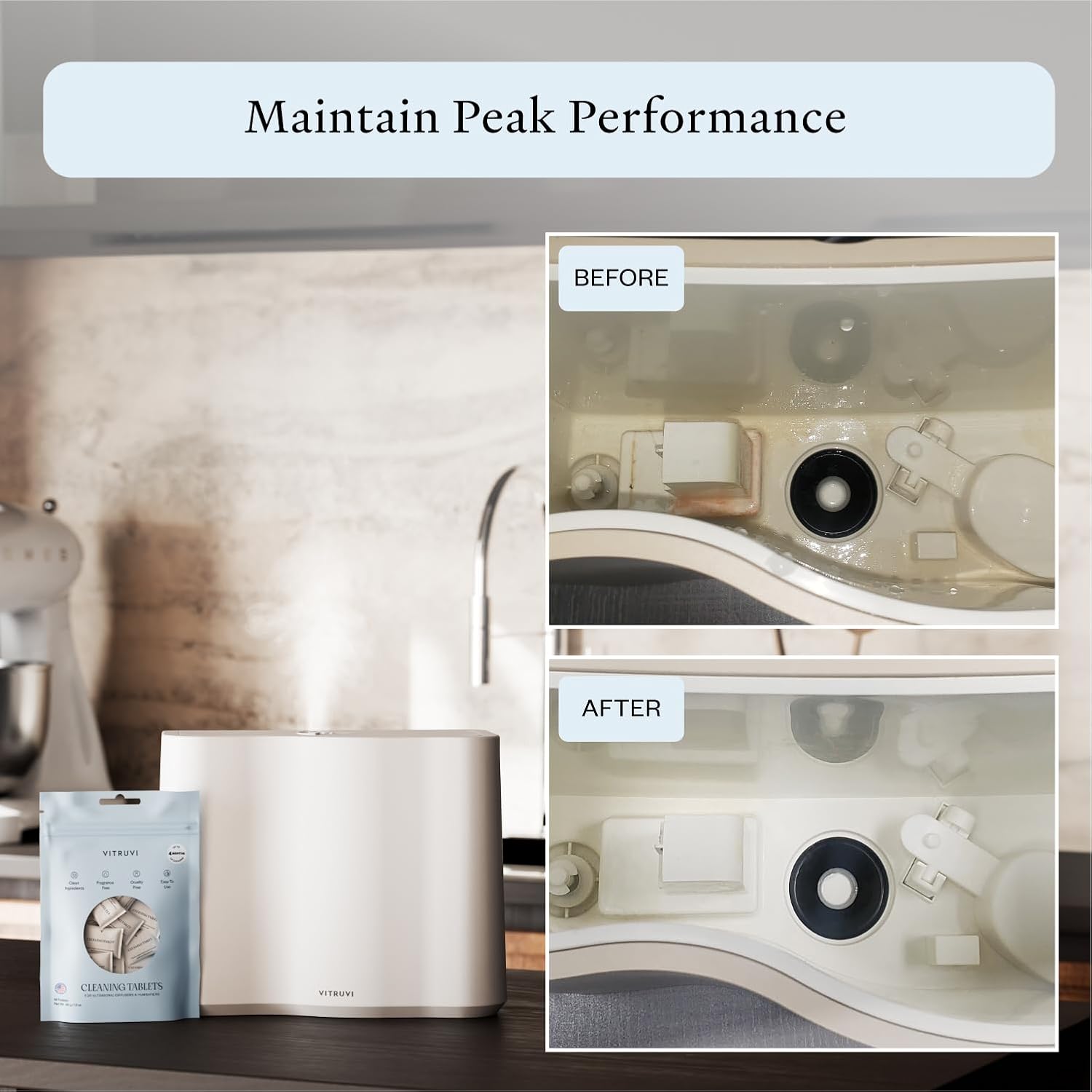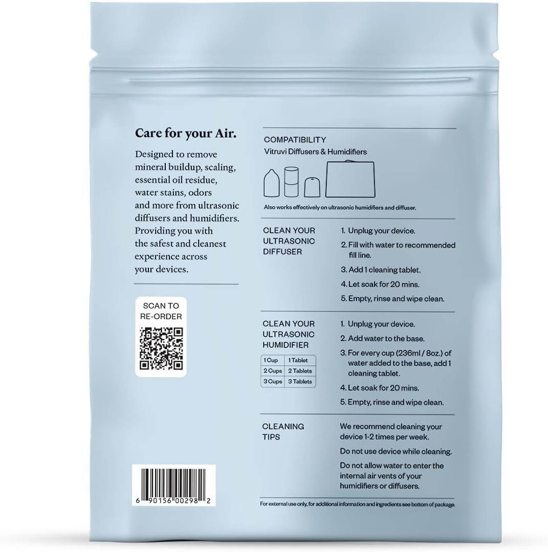 - QUICK CLEANING FOR YOUR DIFFUSER OR HUMIDIFIER: Vitruvi Cleaning Tablets tackle hard water stains, essential oil residue, and mineral buildup in minutes—no scrubbing required, preserving device performance and longevity.