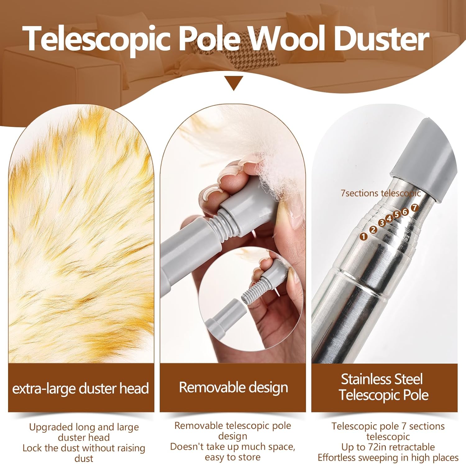 - MATERIAL: This lambswool duster is made of 100% high quality lambswool. The texture of lamb wool is very soft and fluffy, which attracts and holds dust like a magnet! Soft texture will not scratch surfaces, which can be used to clean on a variety of delicate finishes. The wool duster with extension pole will be a good assistant to help you clean your furniture and home