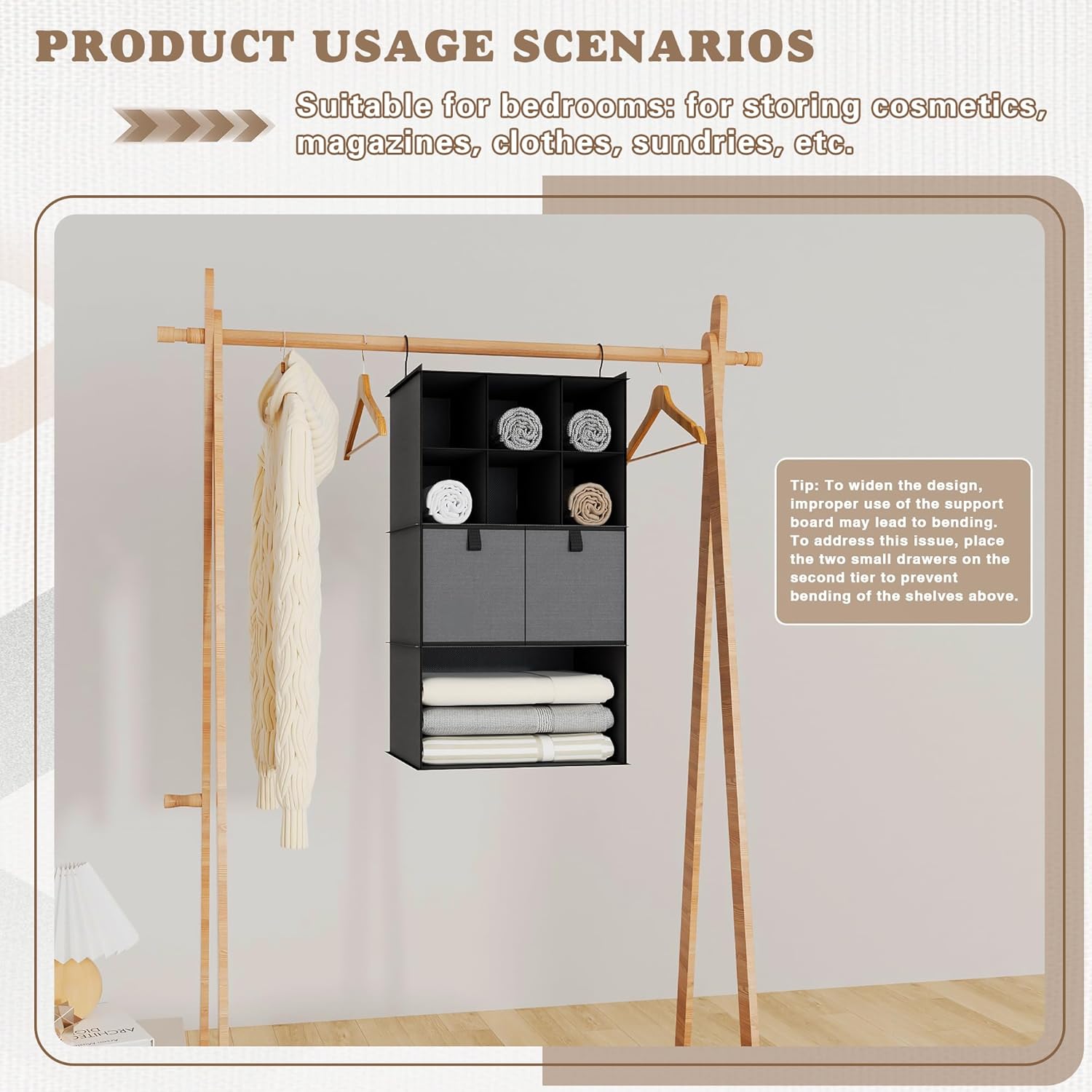 Hanging Closet Organizer 4 Shelves, 2 Drawers Closet Organization and Storage, 6 Compartments Wardrobe Clothes Organizer, Dark Gray
