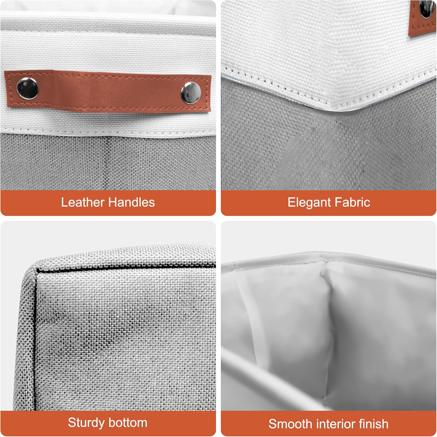 12in Open Fabric Storage Basket with Leather Handles for Organizing, Collapsible Linen Closet Bins for Shelves, Closets, Laundry, Decorative Basket for Gifts. (White&Gray, 3PCS/12x12in)