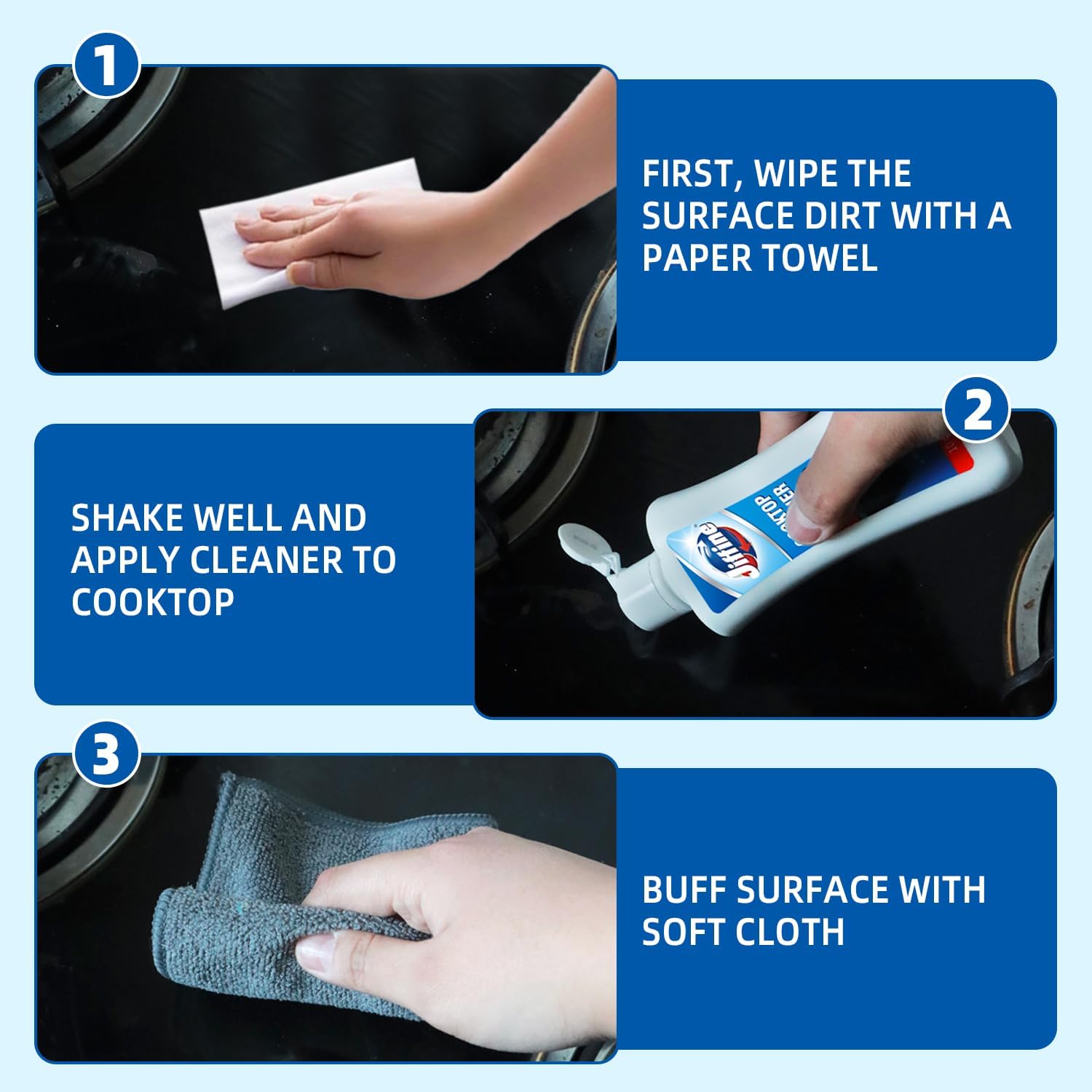 - Scratch-Free & Non-Abrasive Formula:Featuring advanced Micro-bead scrubbing technology, this cleaner lifts tough stains without scratching or damaging your cooktop. The gentle yet effective formula ensures safe cleaning for glass, ceramic, induction, and radiant cooktops.