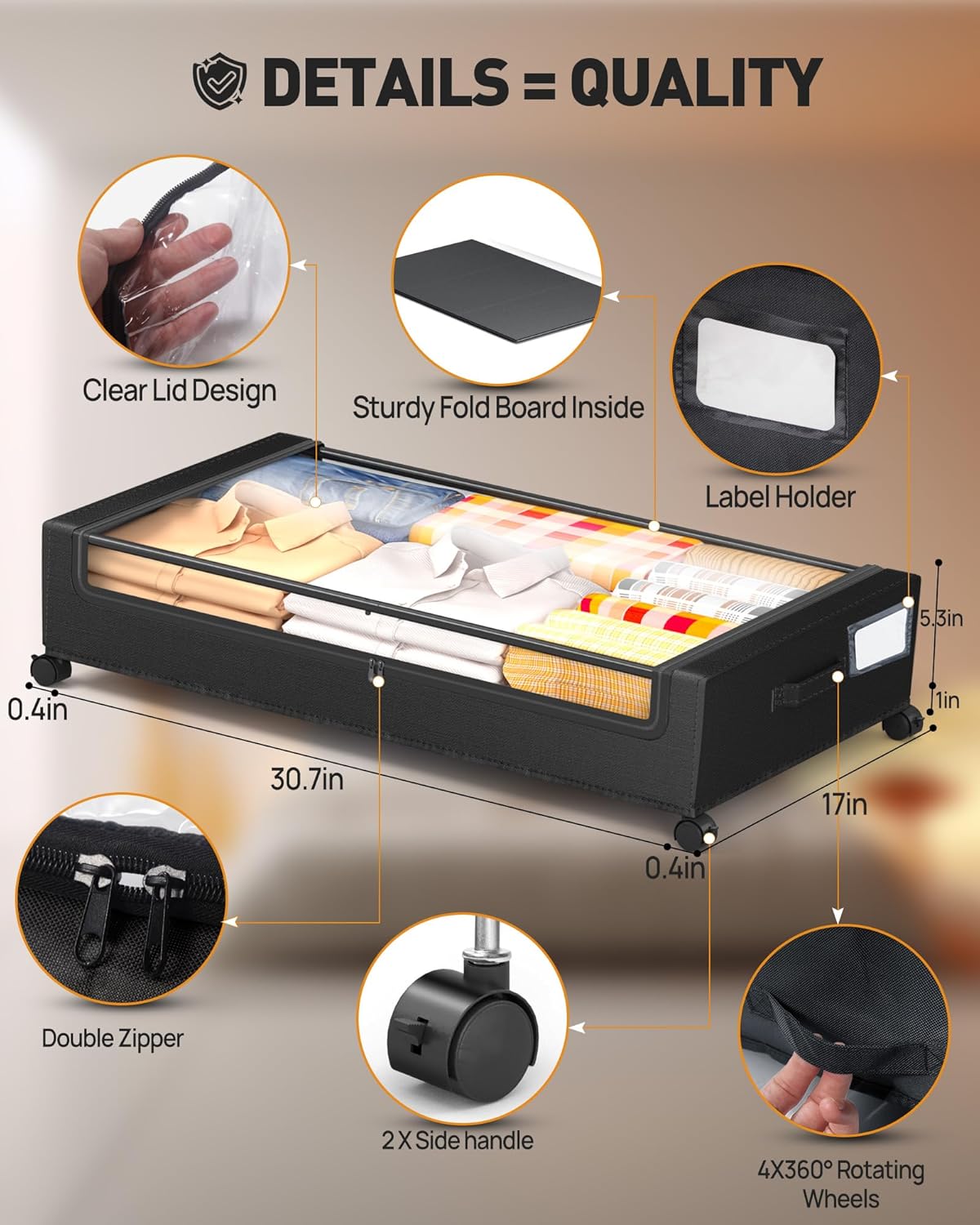 - 【At-a-glance design】Our rolling under the bed storage come with a clear window and label design that allows you to easily and quickly identify the contents of the bin. Say goodbye to the hassle of misplacing items. Plus, your pets will never make a mess under the bed again. With a double zipper design and high-quality materials, the under bed storage bins is completely protected from dust, moisture and dirt, ensuring that your items are clean and dust-free, and saying goodbye to clutter!