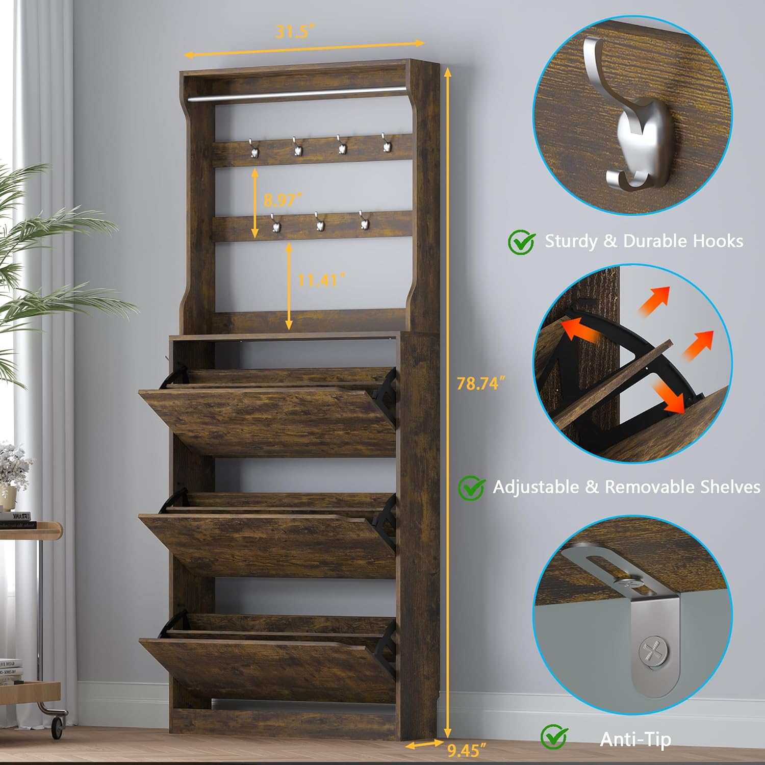 - 【Adjustable & Large Capacity Storage】: BORNOON shoe cabinet measures 9.45"D x 31.5"W x 78.74"H. Each of the 3 flip-out drawers contains an adjustable or removable middle panel, allowing you to customize the space to fit boots, sneakers, heels, and flats. The added coat rack provides hooks and a hanging bar for coats, scarves, and bags.