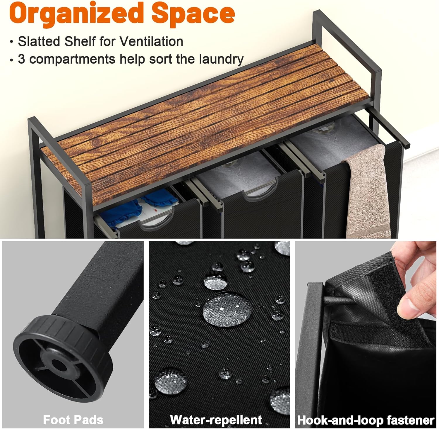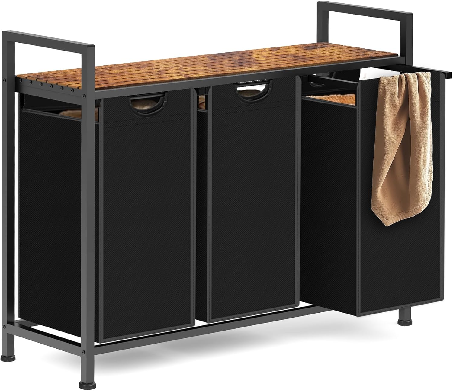 Laundry Hamper, Laundry Sorter with 3 Pull-Out Removable Oxford Fabric Bags Cloth Laundry Basket 3 x 10 Gallons (Black and Rustic Brown)