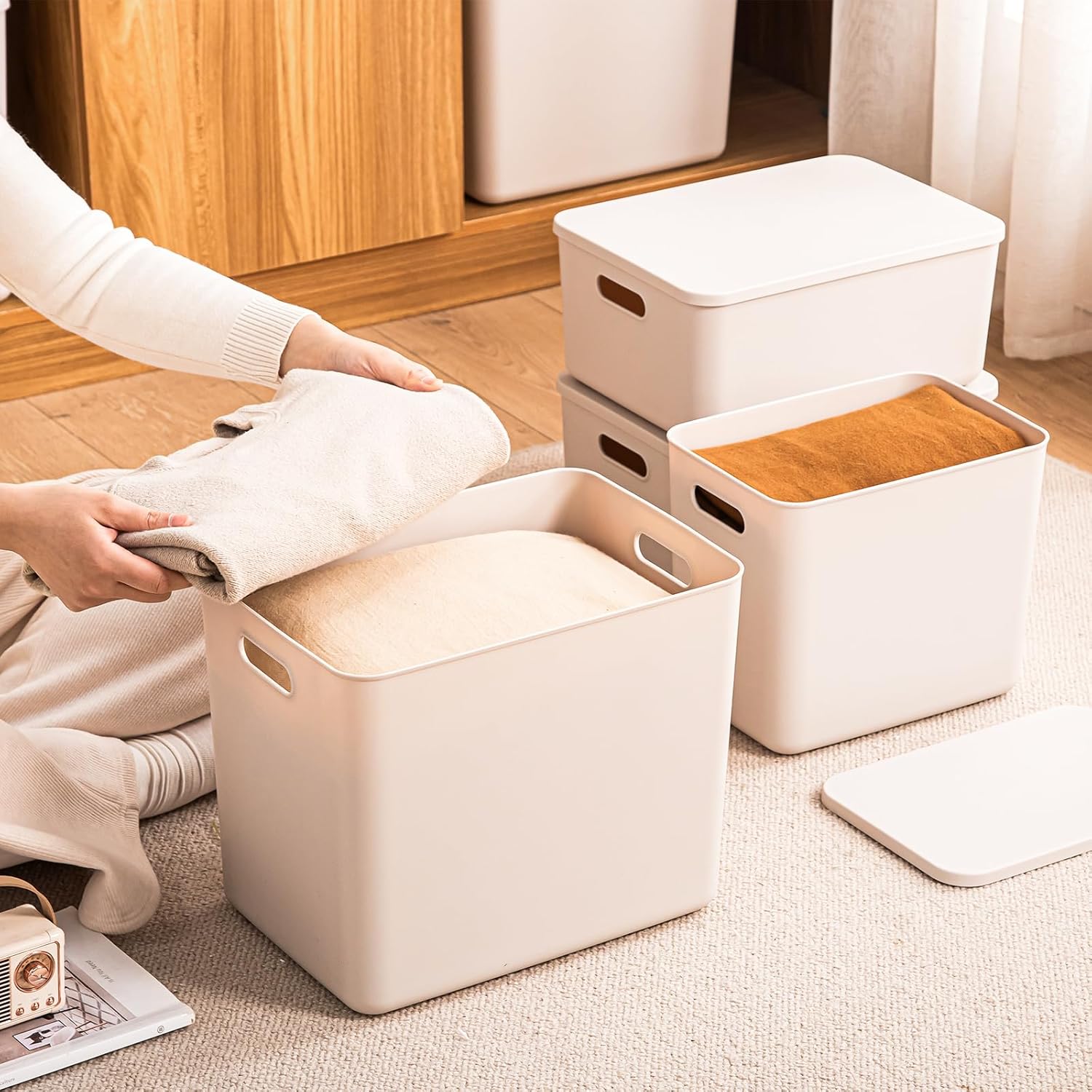 - 【BUILT WITH HANDLE & LID】These storage baskets with lid built with handy handle for easy remove from shelves and easy transport, easy to pull out and lift as the box has handles, these storage organizer with lid can keep contents dry and dust free, but it's not sealed.