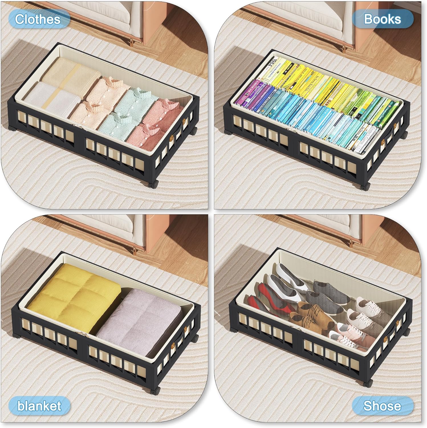 efluky 2-Pack Bamboo Under Bed Storage Containers with Wheels, Under Bed Clothes Storage Basket with Large Dust Bag, Rolling UnderBed Storage for Bedroom, Dorm and Basement, Black