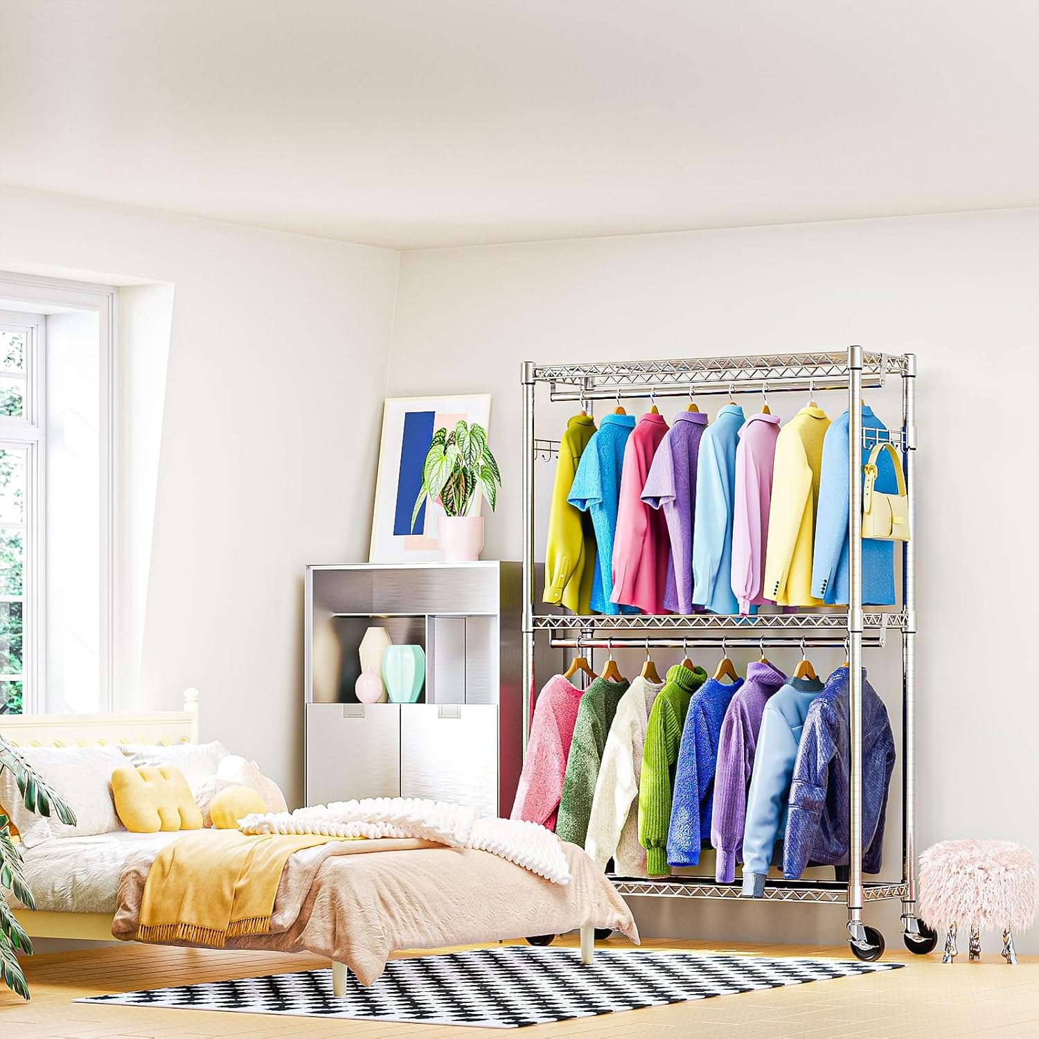Heavy Duty Rolling Garment Rack 3 Tiers Adjustable Wire Shelving Clothes Rack with 2 Rods and Side Hooks,Storage Closet Clothing Rack with Wheels Chrome 15.7" D x 45.3" W x 79.6" H
