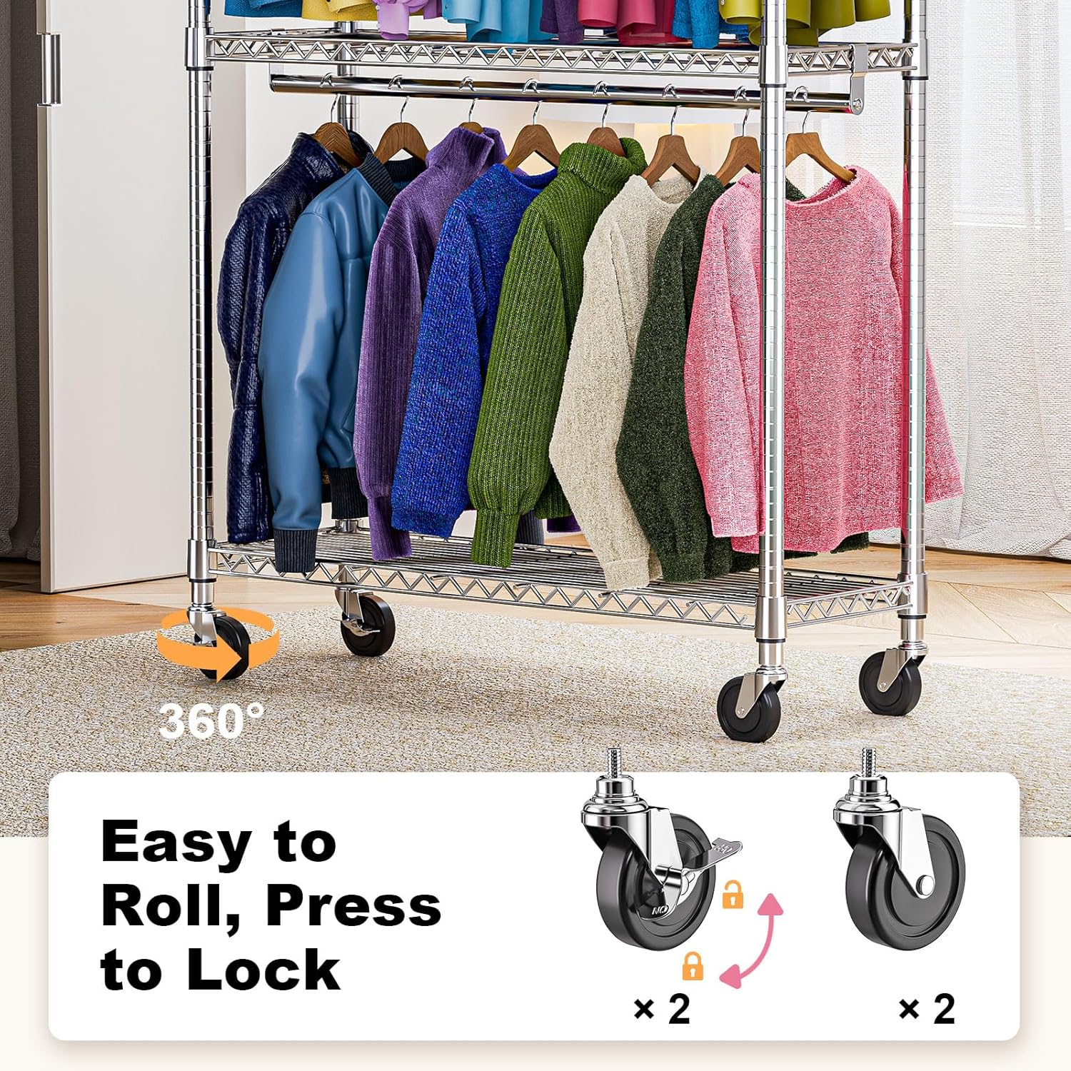 - Impressive Weight Capacity – Designed for strength, the clothing rack holds up to 1050 lbs when stationary and supports approximately 300-350 lbs with wheels, making it ideal for both light and heavy storage.