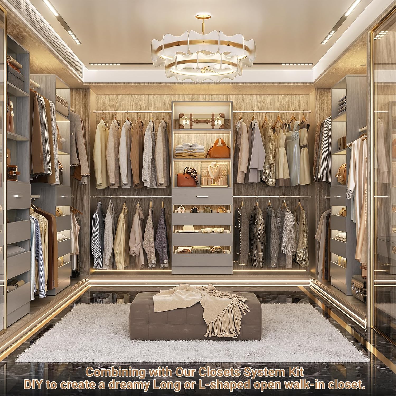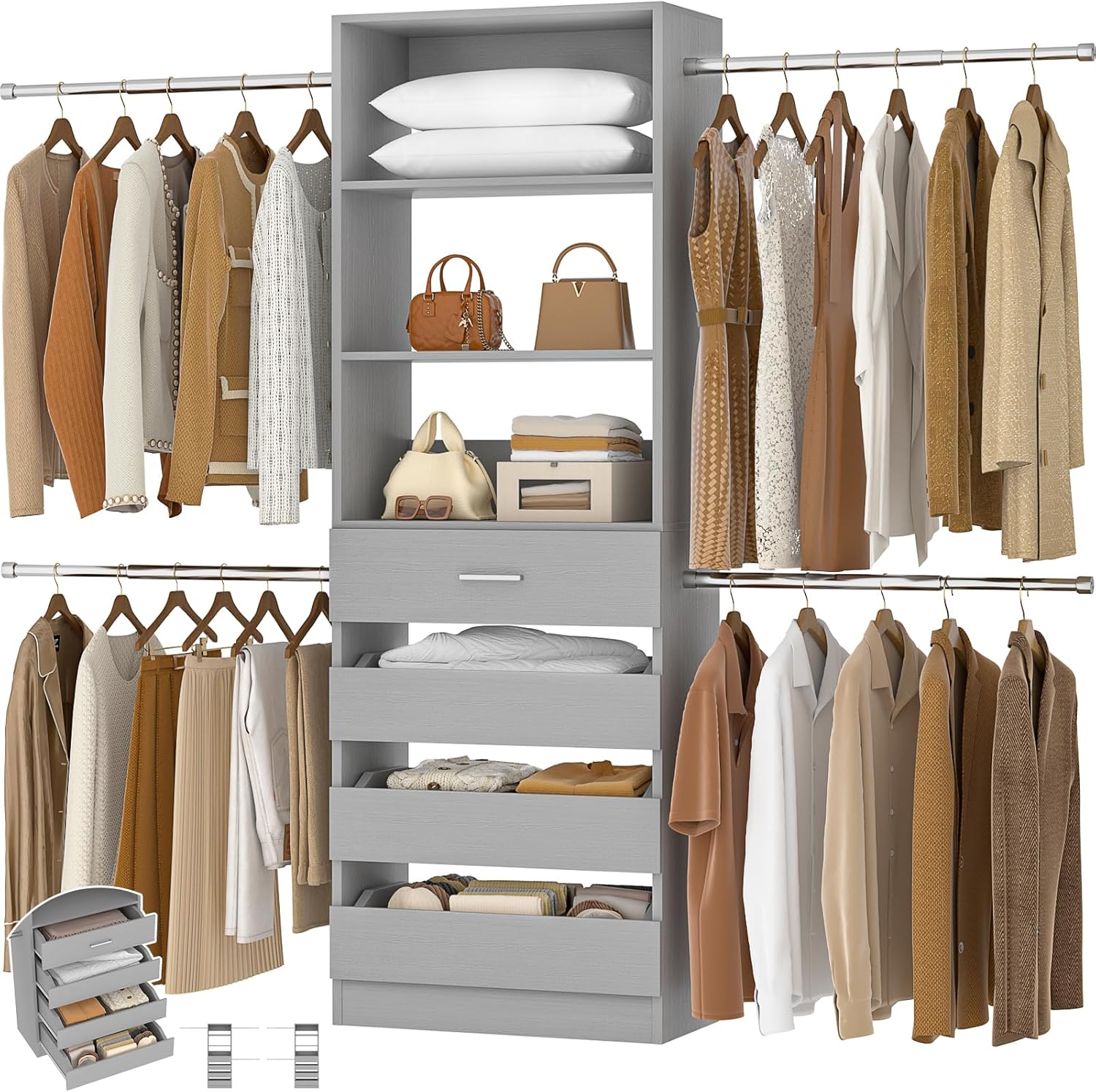 - Aheaplus Closet System, 4-9FT Closet Organizer with 4 Wooden Drawers, Wood Closet Organizer System with Tower, Walk-in Closet Organizer Wardrobe Clothes Rack with 4 Hanging Rods, Garment Rack, Grey