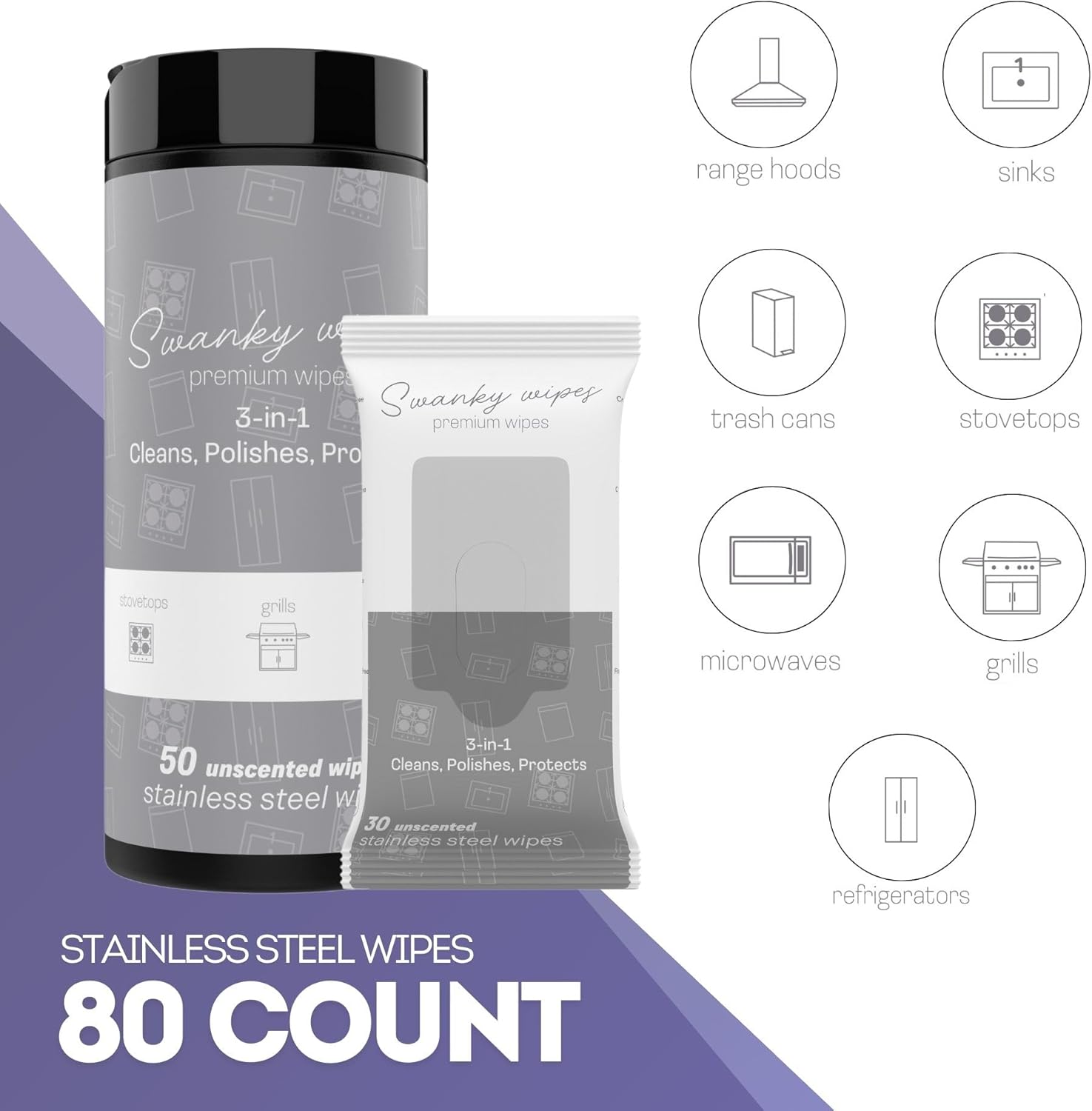 - PRODUCT SPECS – Swanky Stainless Steel Cleaning Wipes come in a bundle with Soft Wipes (30 Count) & Canister (50 Count). Each wipe is pre-moistened and ready to use, making them a convenient addition to your cleaning supplies. Ideal for keeping your stainless steel appliances looking polished and clean.