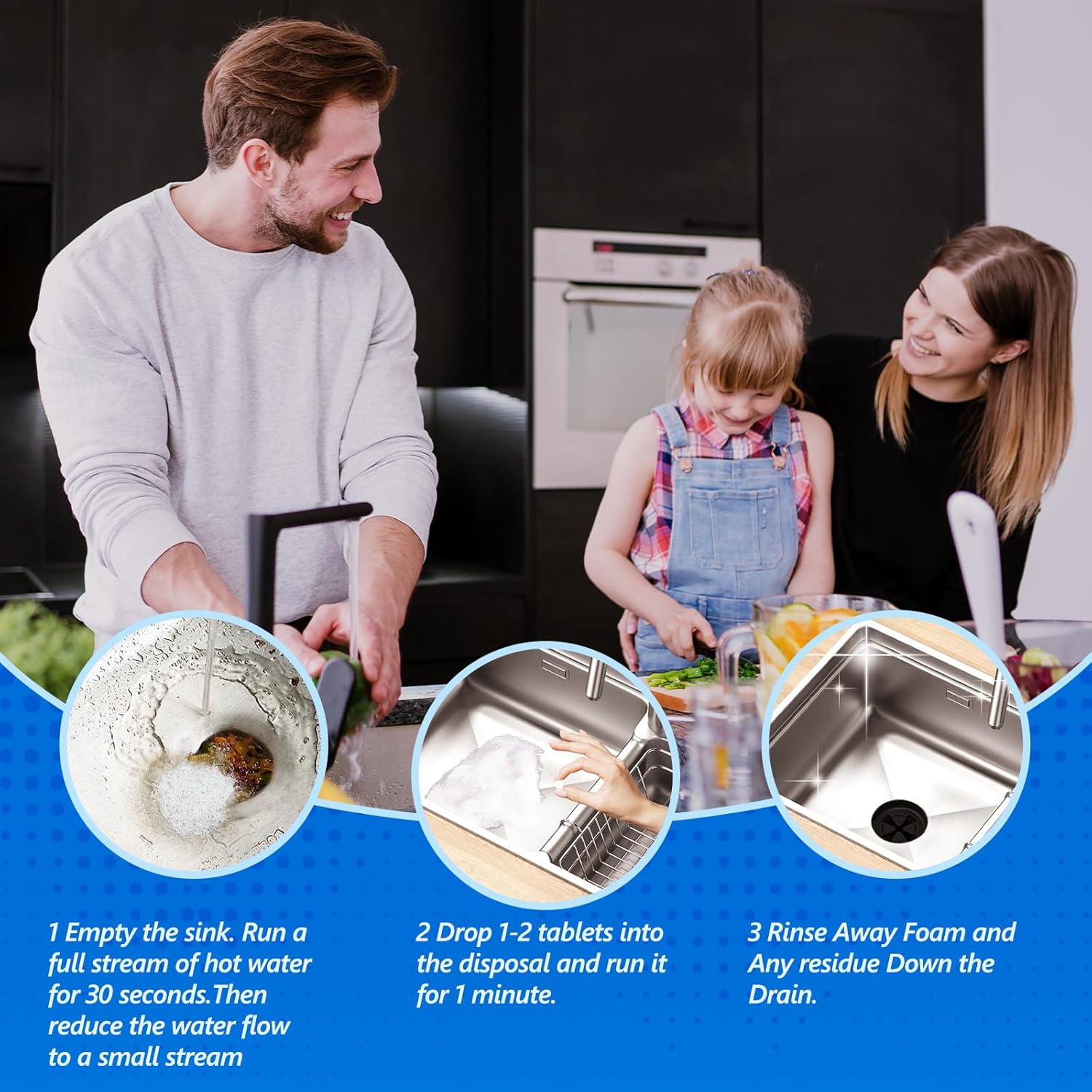 - Easy To Use:Empty the sink. Run a full stream of hot water for 30 seconds.Then reduce the water flow to a small stream.Drop 1-2 tablets into the disposal and run it for 1 minute.Rinse Away Foam and Any residue Down the Drain.