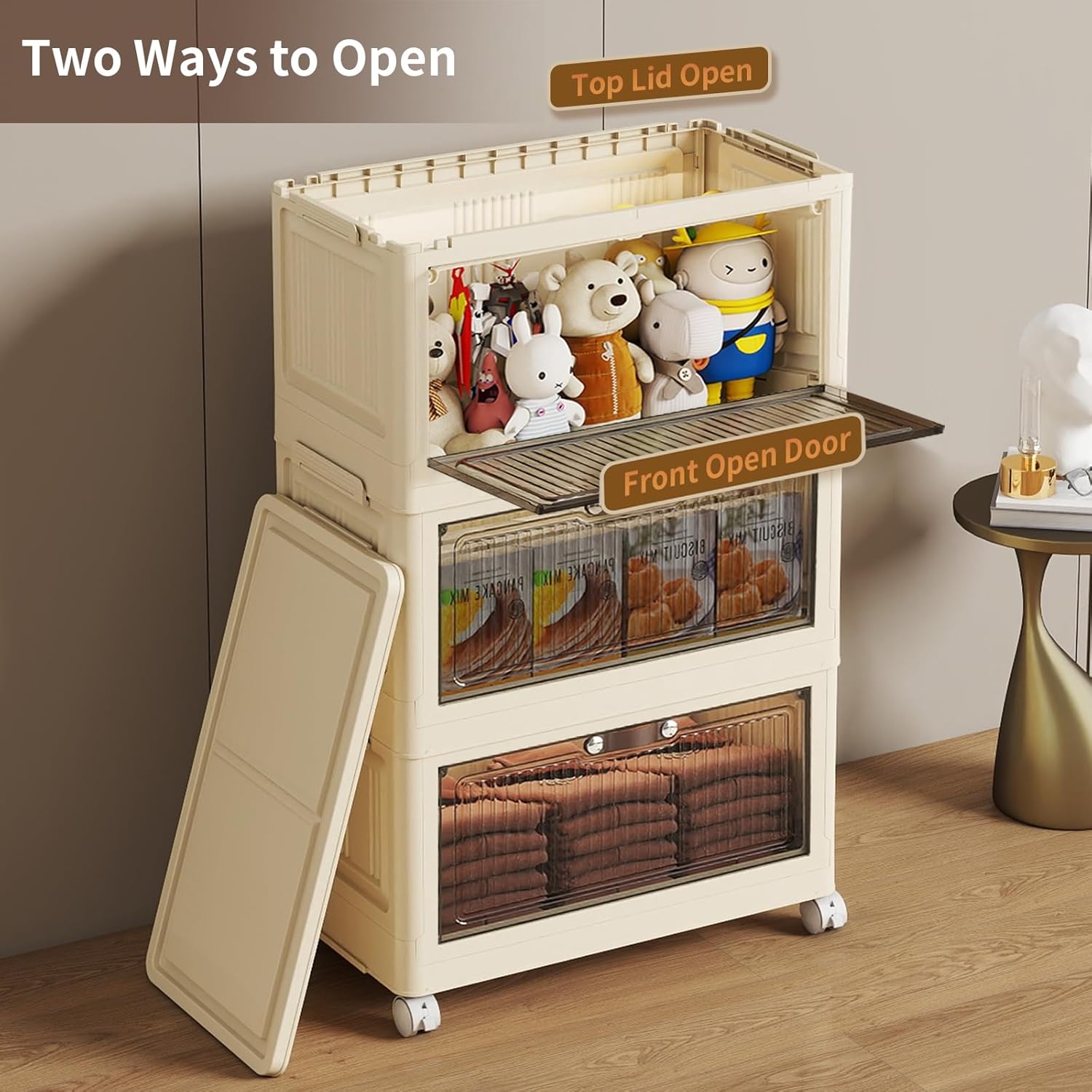 3 Tier - 48QT Storage Bins with Lids, Collapsible Storage Bins with Doors and Wheels, Plastic Storage Cabinet for Easy Storage and Organization for Living Room, Office
