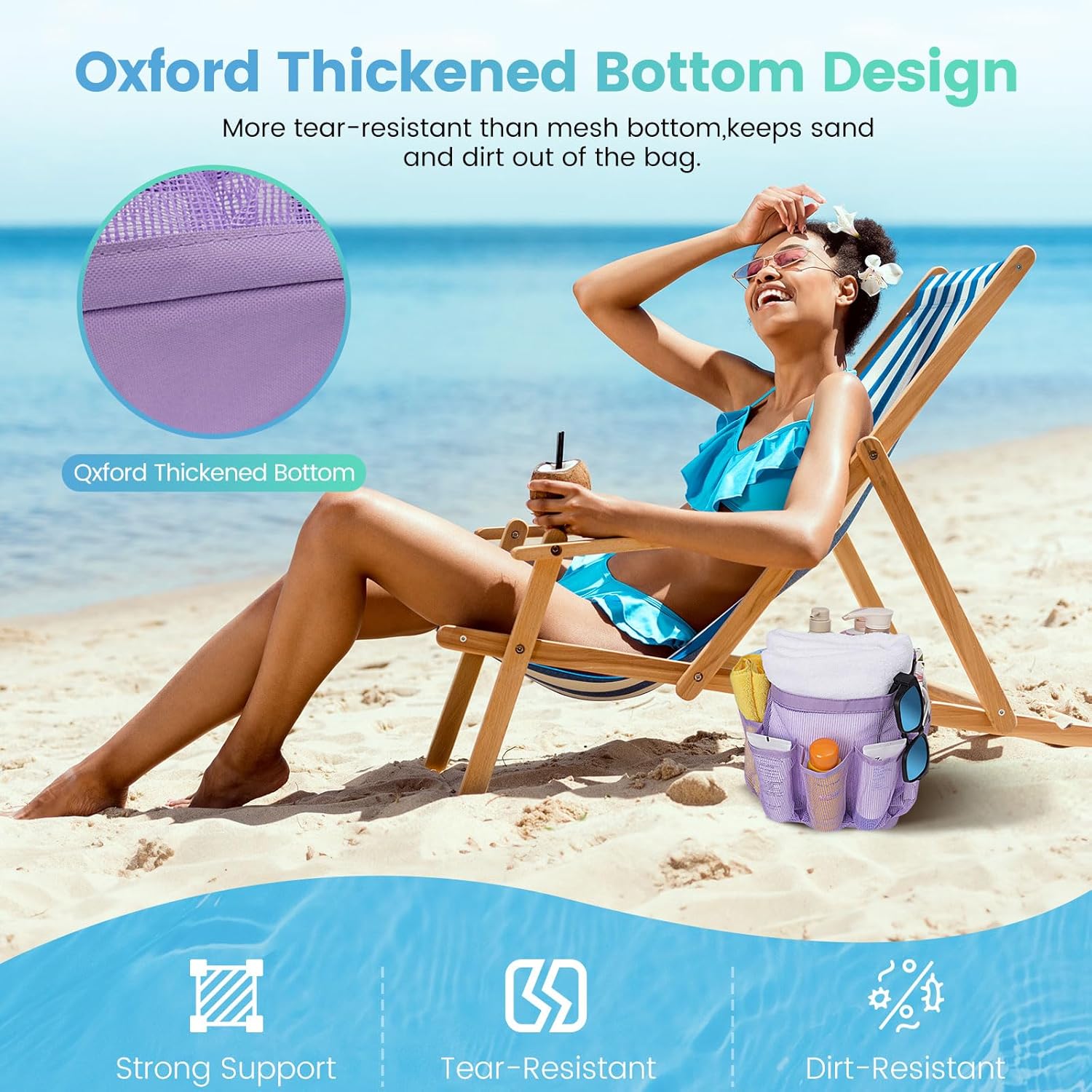 - Reinforced Oxford Base, Stronger Support:For the most essential part of this beach bag, we utilize highly strong and durable Oxford fabric for the bag base, delivering higher weight capacity, wear and tear resistance. The base supports travel essentials firmly and keeps them away from sand.