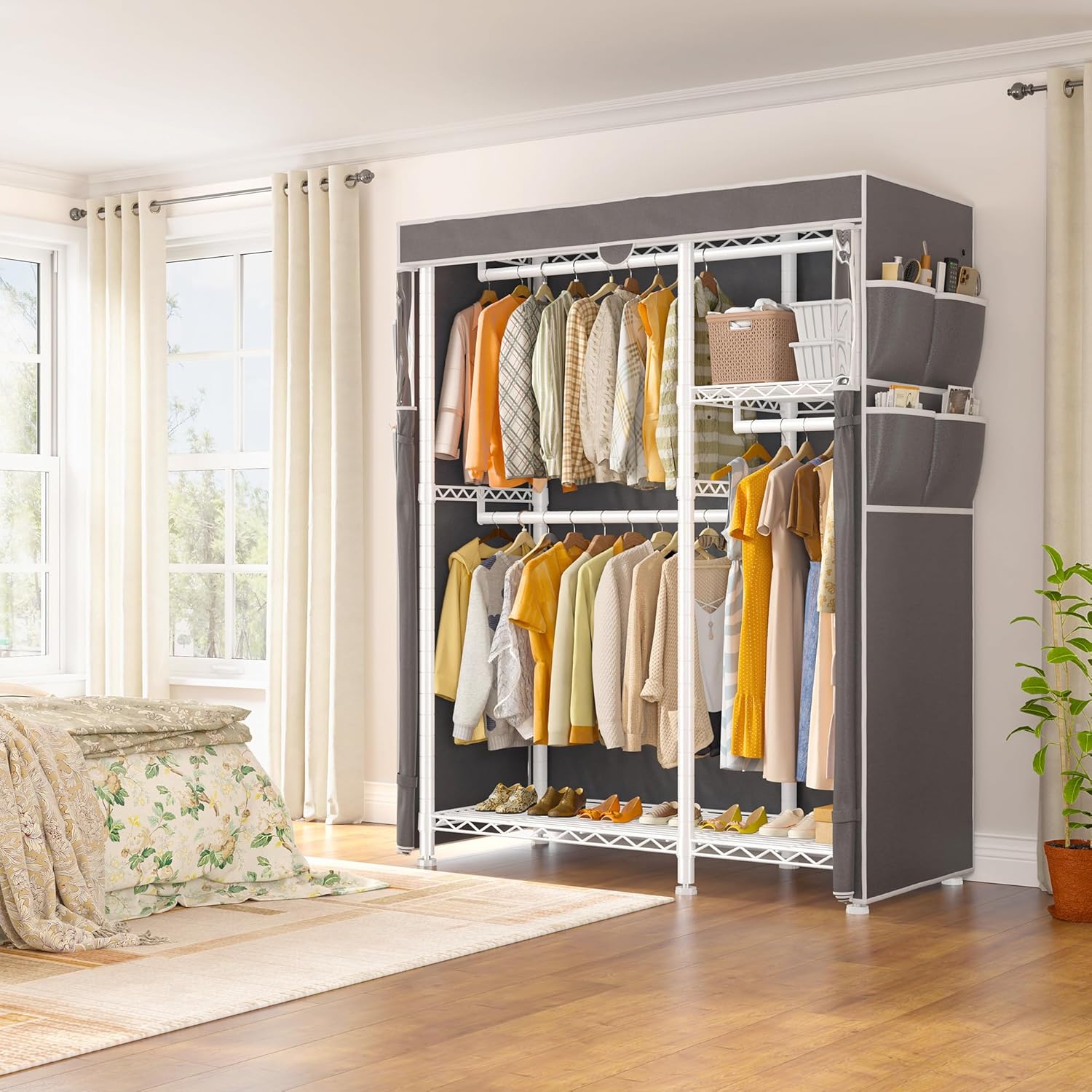 - Ideal Method of Storing Clothes:Dimensions:44.88"W x 16.54"D x78.74"H.The clothes rack with cover is composed of three thick rails and a adjustable shelf, providing three areas for hanging short clothes and one area for long clothes.Max loads 220 lbs(135lbs when rolling), the clothing racks for hanging clothes can effortlessly hold over 150+ clothes,20+ daily shoes and bags.