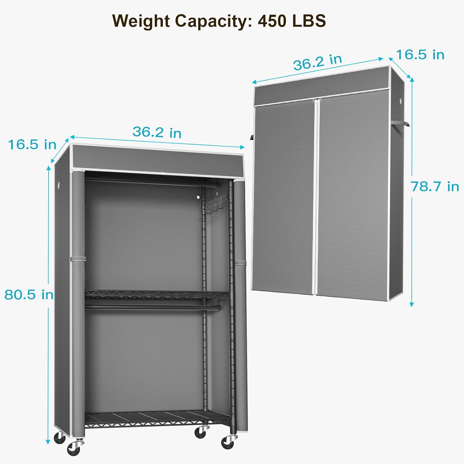 - Overall Dimension: The covered clothes rack whole size is 36.2"W x 16.5"D x 80.5"H, which combines with 3 wire shelves and 2 hanger rods for loading 450 lbs