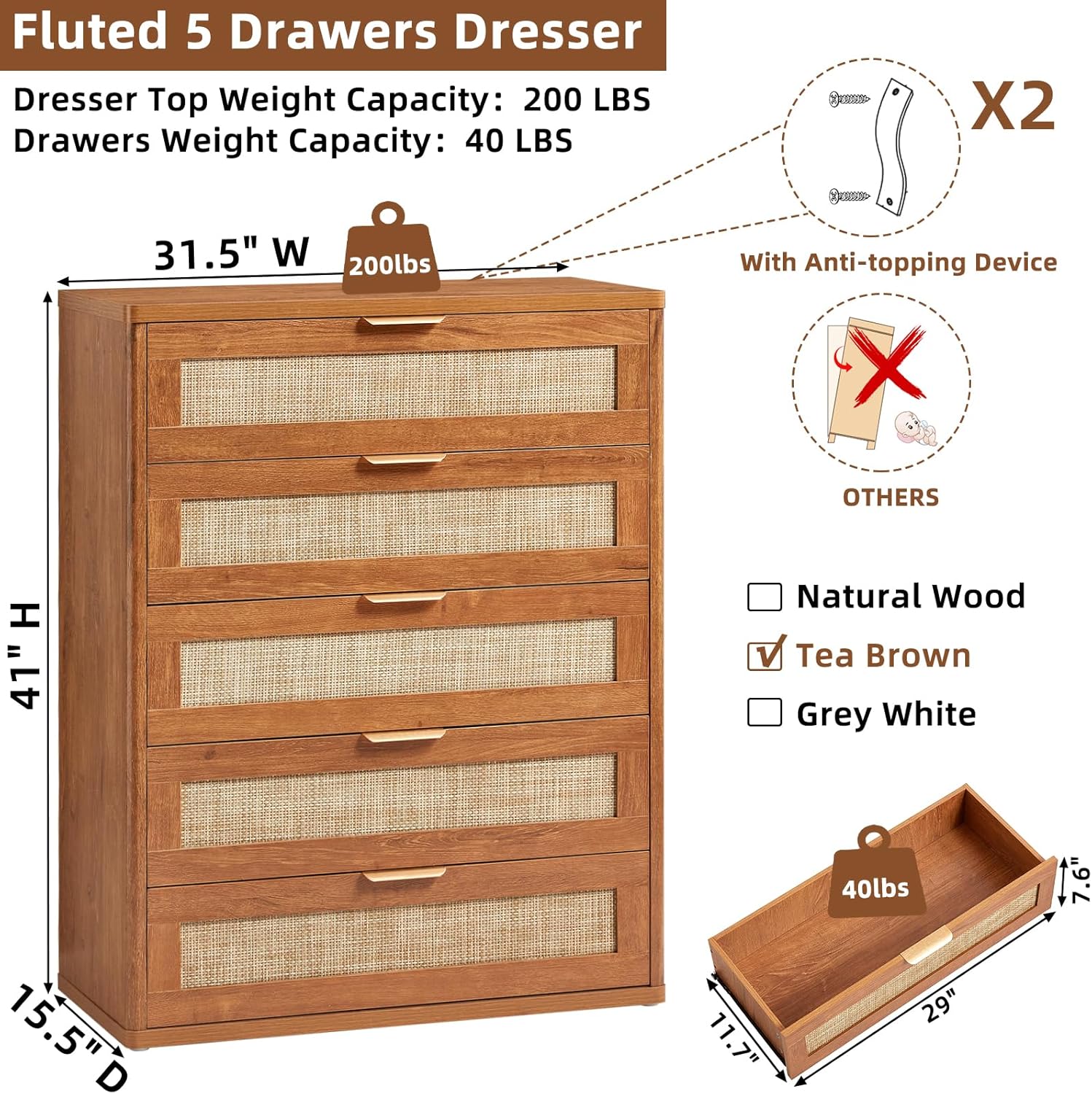 LEYAOYAO Dresser for Bedroom, 41" Tall Chest of Drawers, Modern 5 Drawers Boho Rattan Dressers with Storage, Dresser Wooden Closet Organizer for Living Room, Hallway, Tea Brown