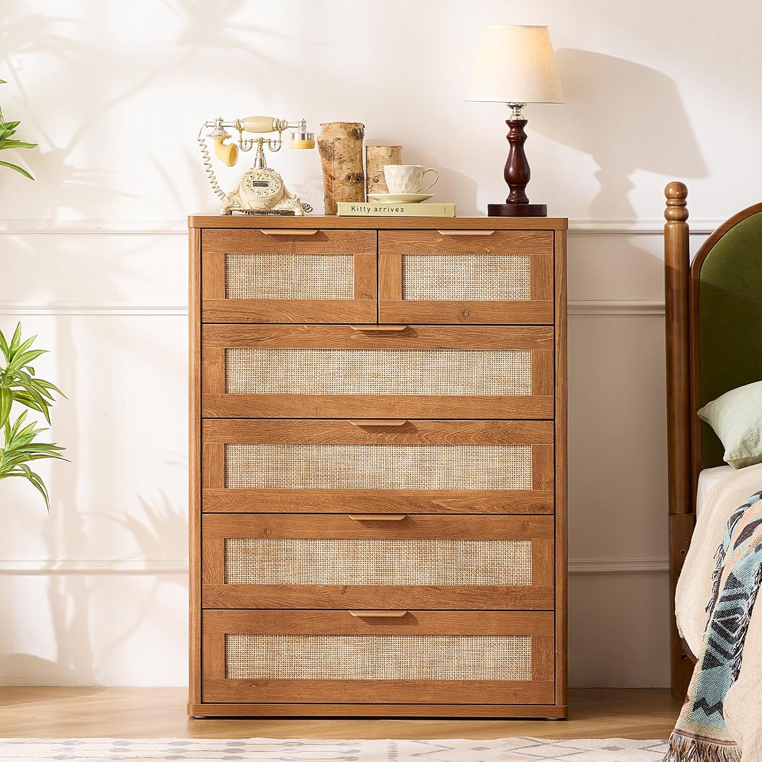 - Boho 6 Drawers Rattan Dresser for Bedroom : This 6 Drawer Wood Dresser flawless combines Boho and modern styles. The rattan-decorated drawers and natural wood grain enhance its visual appeal. This exquisite dresser for closet is available in multiple color options, easily blending into various decor styles to create a cozy home atmosphere.