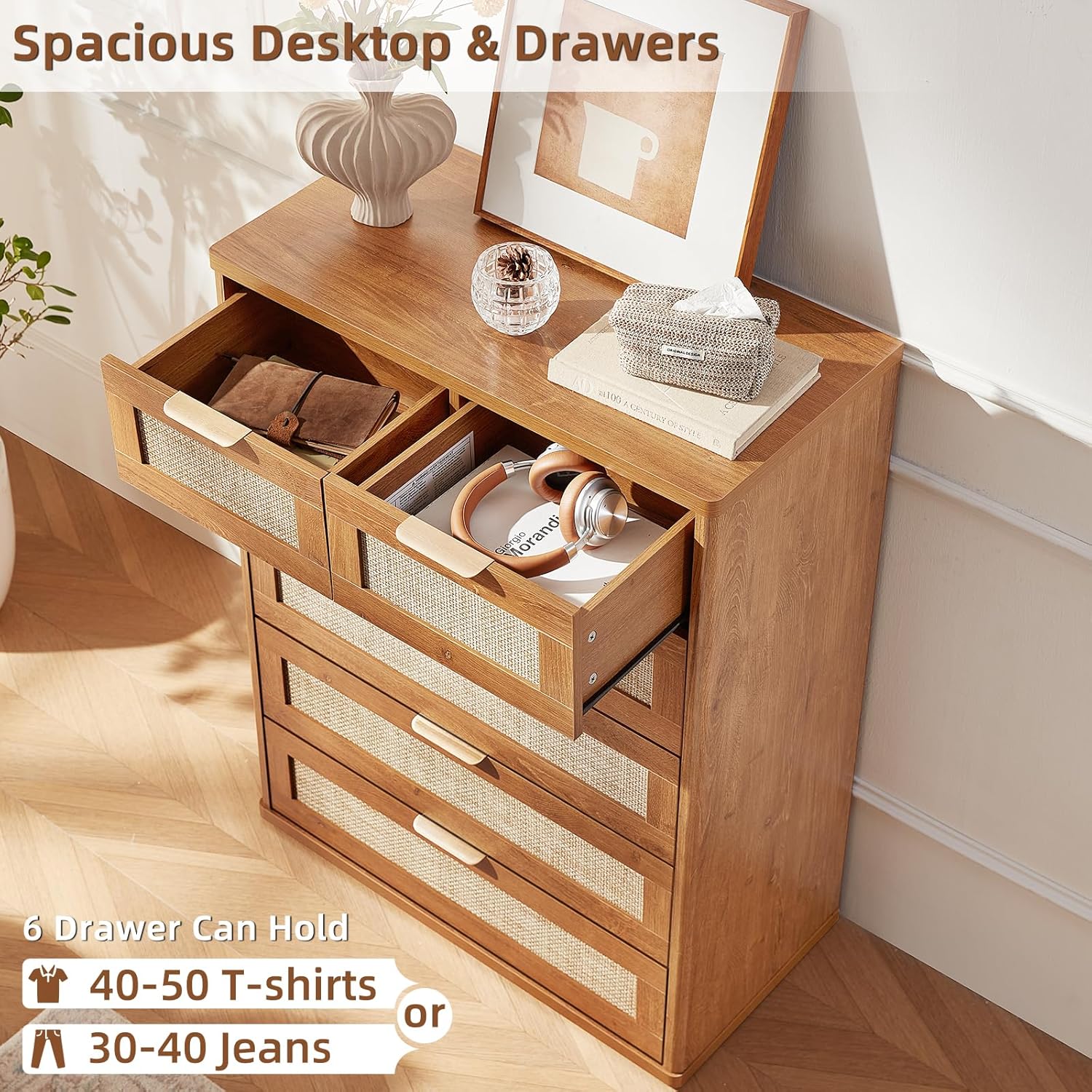 - Spacious 6 Drawer Chest of Drawers, Maximizing Your Storage Potential : This 6-Drawer boho dresser consists of four large drawers and two small drawers, unlocking your exclusive storage aesthetic. Our mid-century modern dresser features 6 spacious drawers, the spacious desktop of the closet dressers with drawers is flawless for displaying various decorations. Whether for daily use or organizing and storing, the dresser for bedroom meets your diverse needs.