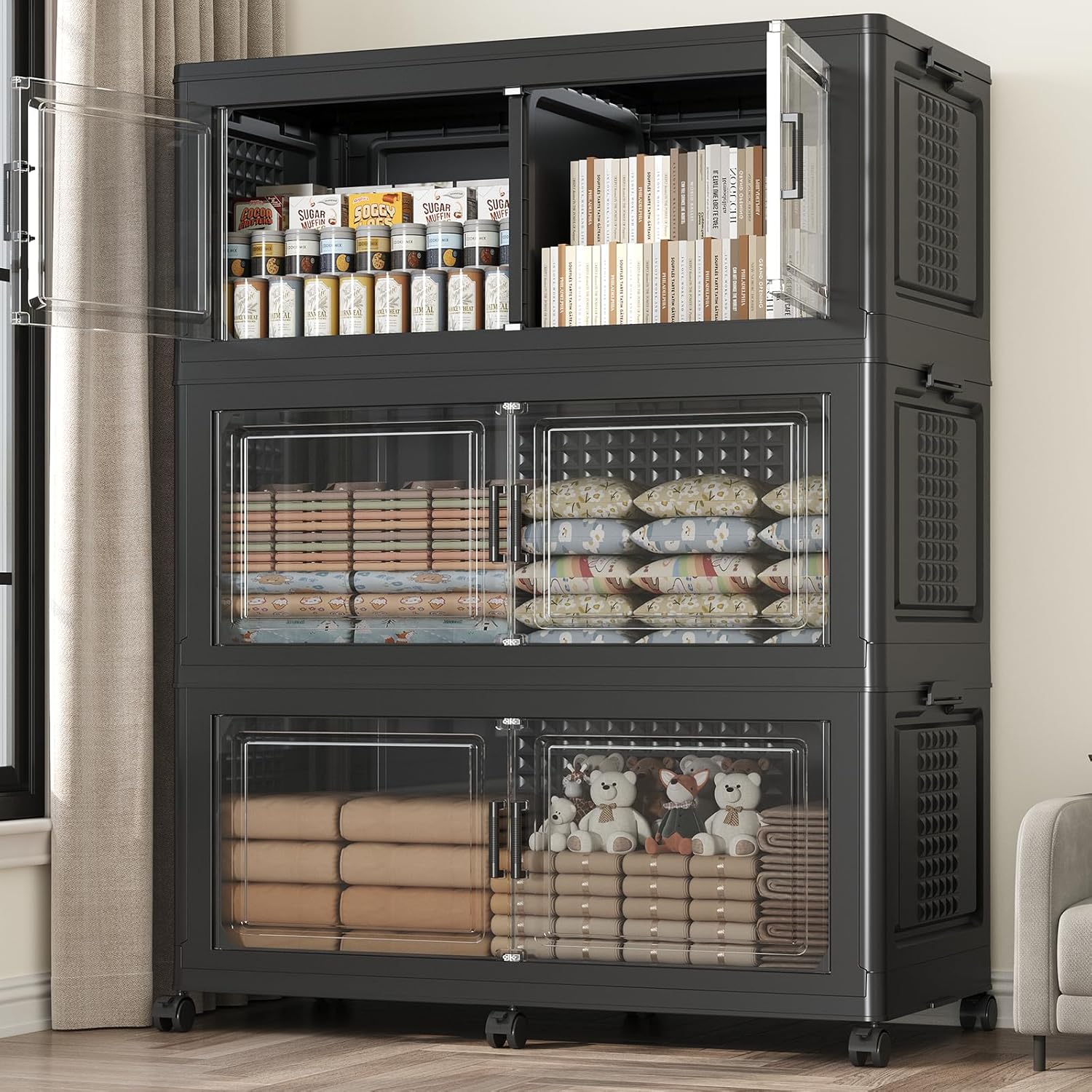- 【Foldable, Stackable, Mobile, No Assembly】Our stackable storage bins open front can be quickly unfolded or collapsed in just 3 minutes to maximize space utilization. It can be stacked layer by layer into a cabinet, with side buckles to secure each level in place, preventing tipping or scattering. The bottom is equipped with 6 universal wheels for easy mobility. An essential large storage bin for homes and dorms.